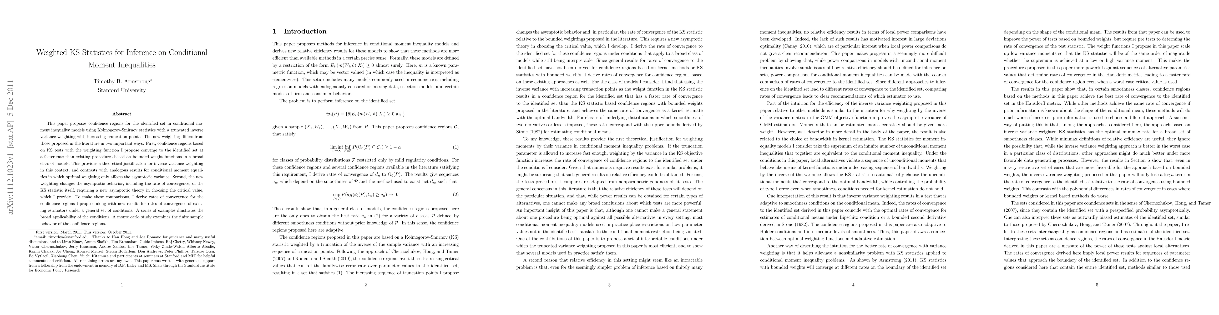 This paper introduces a new method for confidence regions in conditional moment inequality models using weighted Kolmogorov-Smirnov statistics with increasing truncation points, providing faster convergence rates and changing the asymptotic behavior of the statistic.
