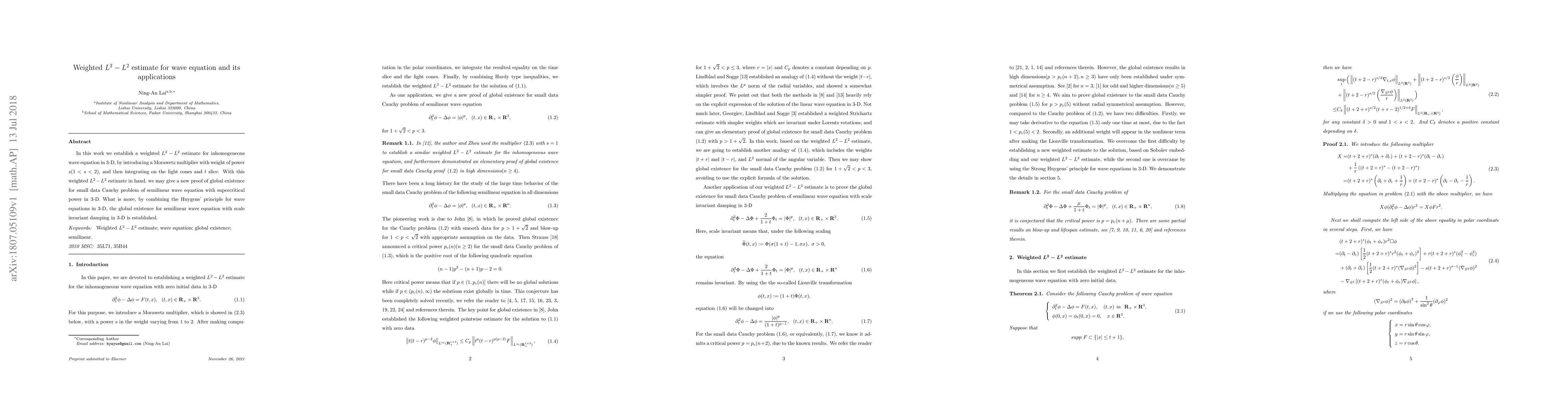 This paper establishes a weighted $L^2-L^2$ estimate for the inhomogeneous 3-D wave equation using a Morawetz multiplier, leading to a new proof of global existence for small-data Cauchy problems of semilinear wave equations with supercritical powers in 3-D. Additionally, it combines this estimate with Huygens' principle to prove global existence for semilinear wave equations with scale invariant damping in 3-D.