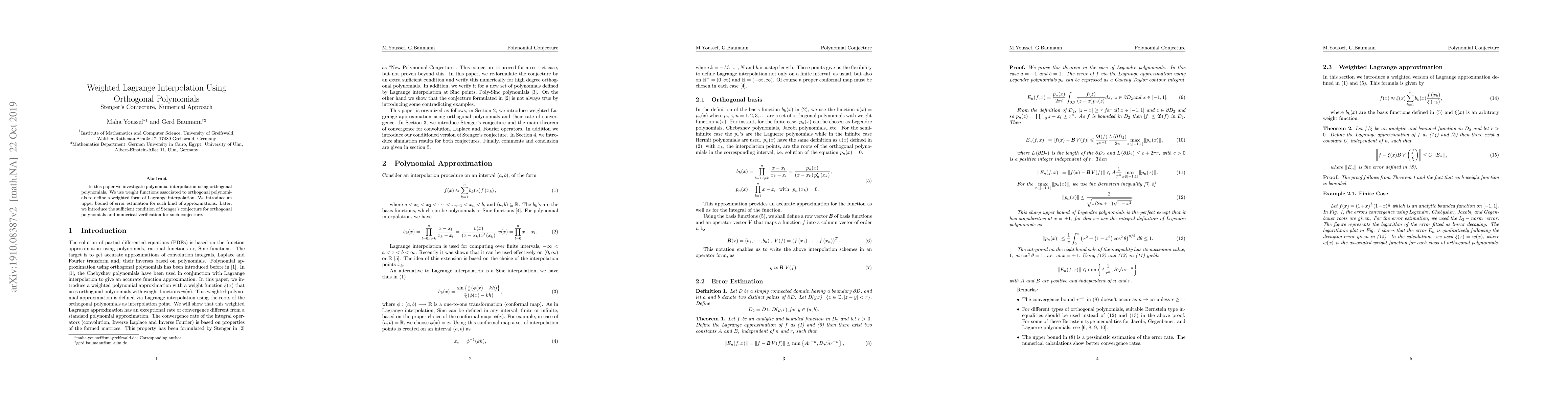 In this paper we investigate polynomial interpolation using orthogonal polynomials. We use weight functions associated with orthogonal polynomials to define a weighted form of Lagrange interpolation. We introduce an upper bound of error estimation for such kinds of approximations. Later, we introduce the sufficient condition of Stenger's conjecture for orthogonal polynomials and numerical verification for such conjecture.
