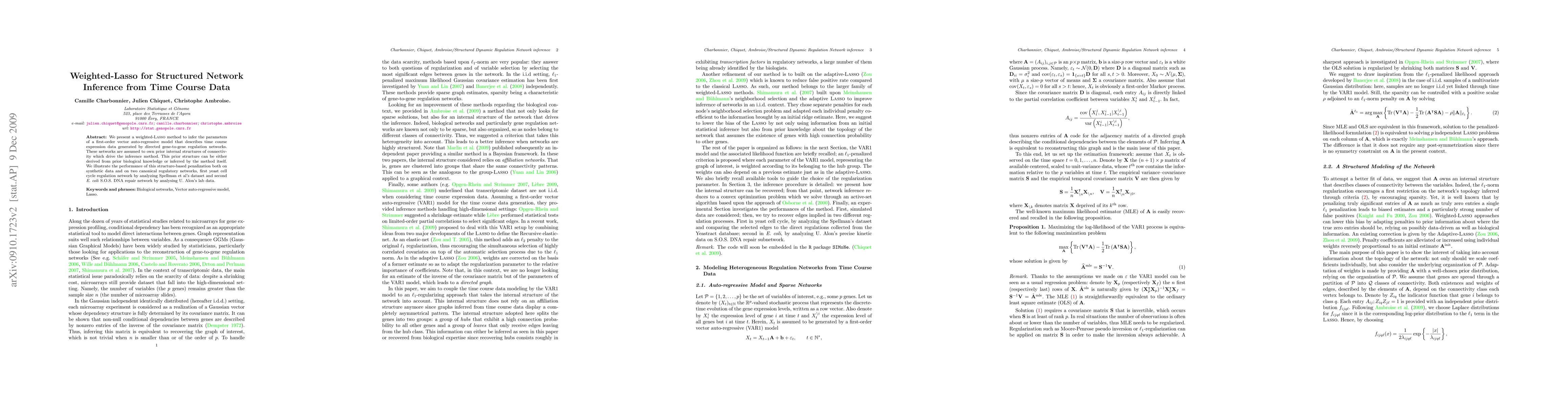 We present a weighted-Lasso method to infer the parameters of a first-order vector auto-regressive model that describes time course expression data generated by directed gene-to-gene regulation networks. These networks are assumed to own a prior internal structure of connectivity which drives the inference method. This prior structure can be either derived from prior biological knowledge or inferred by the method itself. We illustrate the performance of this structure-based penalization both on synthetic data and on two canonical regulatory networks, first yeast cell cycle regulation network by analyzing Spellman et al's dataset and second E. coli S.O.S. DNA repair network by analysing U. Alon's lab data.