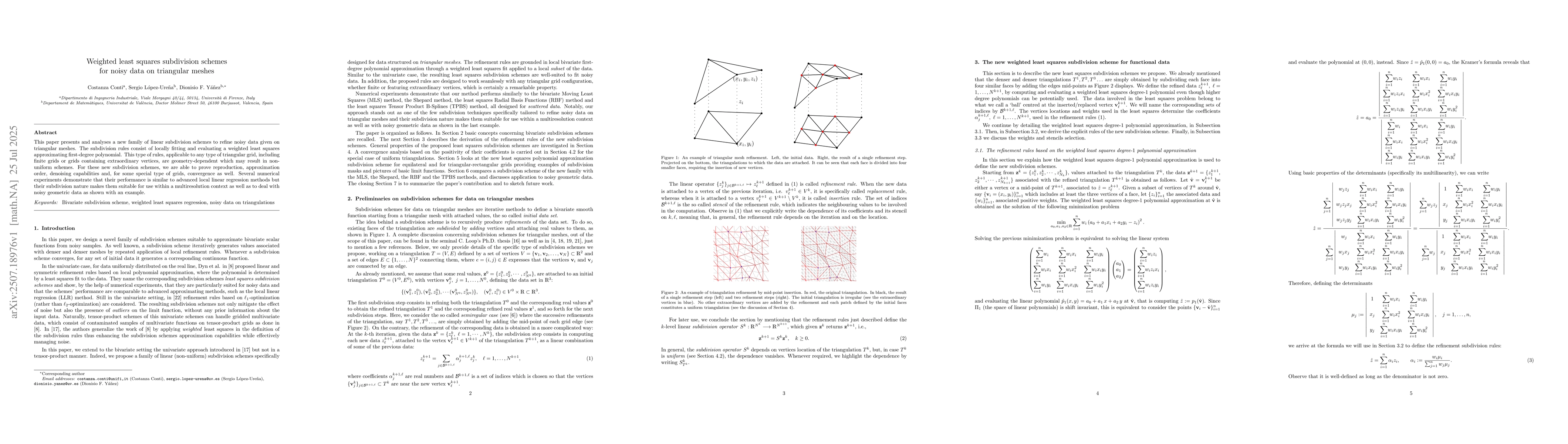 This paper presents and analyses a new family of linear subdivision schemes to refine noisy data given on triangular meshes. The subdivision rules consist of locally fitting and evaluating a weighted least squares approximating first-degree polynomial. This type of rules, applicable to any type of triangular grid, including finite grids or grids containing extraordinary vertices, are geometry-dependent which may result in non-uniform schemes. For these new subdivision schemes, we are able to prove reproduction, approximation order, denoising capabilities and, for some special type of grids, convergence as well. Several numerical experiments demonstrate that their performance is similar to advanced local linear regression methods but their subdivision nature makes them suitable for use within a multiresolution context as well as to deal with noisy geometric data as shown with an example.