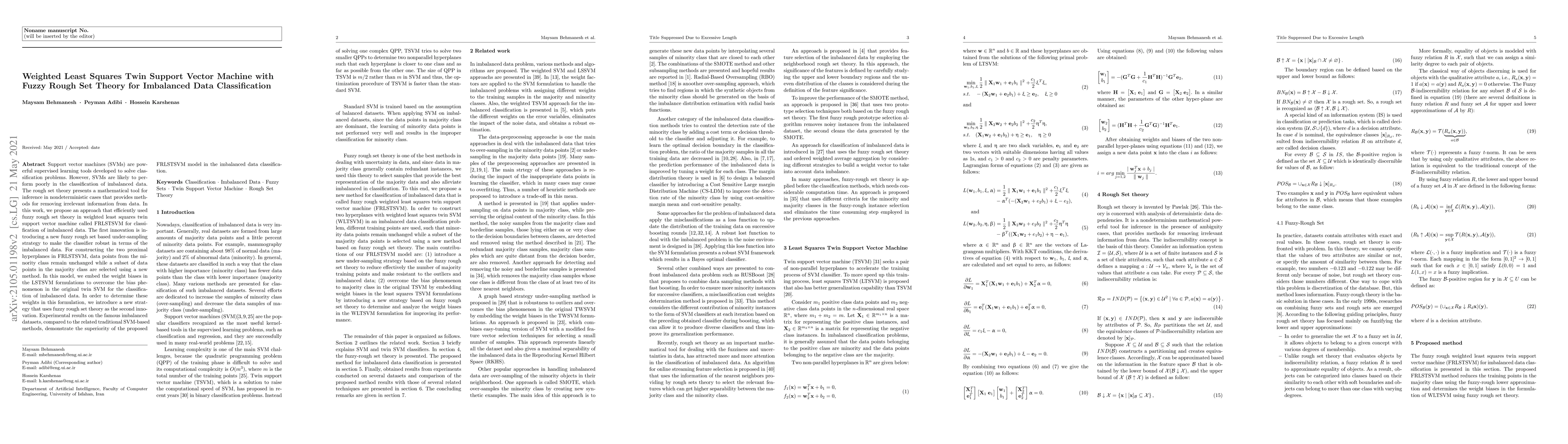 This paper proposes a novel Weighted Least Squares Twin Support Vector Machine (FRLSTSVM) incorporating fuzzy rough set theory to address imbalanced data classification. It introduces a new fuzzy rough set-based under-sampling strategy and a weight bias embedding method to improve classification performance on imbalanced datasets. Experimental results show superior performance compared to traditional SVM-based methods.