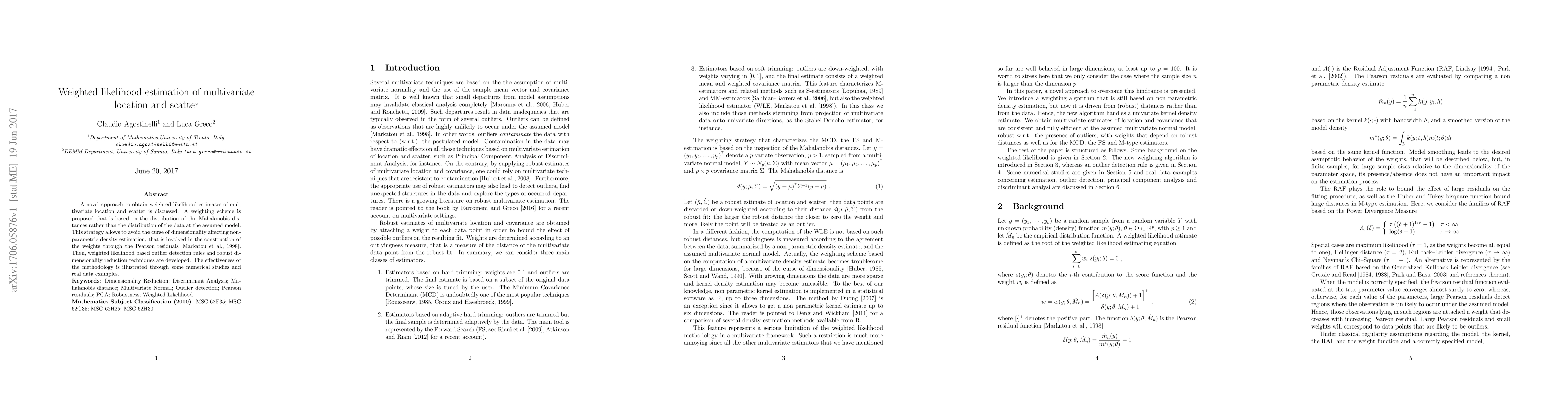 This paper proposes a novel weighted likelihood estimation method for multivariate location and scatter that utilizes Mahalanobis distances, circumventing the curse of dimensionality. It also develops robust techniques for outlier detection and dimensionality reduction, validated through numerical and real data examples.
