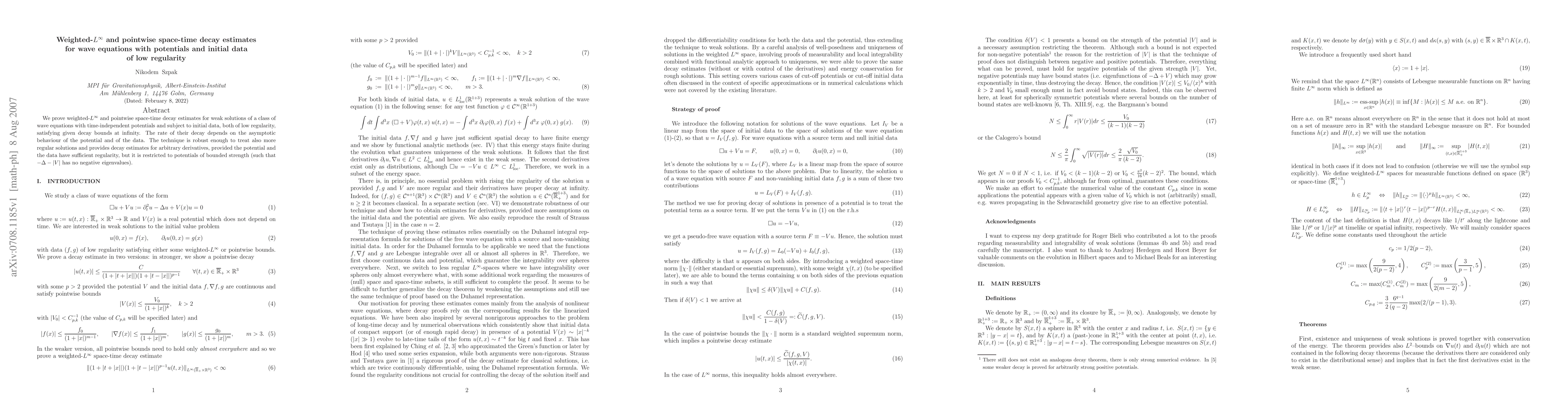 We prove weighted-$L^\infty$ and pointwise space-time decay estimates for weak solutions of a class of wave equations with time-independent potentials and subject to initial data, both of low regularity, satisfying given decay bounds at infinity. The rate of their decay depends on the asymptotic behaviour of the potential and of the data. The technique is robust enough to treat also more regular solutions and provides decay estimates for arbitrary derivatives, provided the potential and the data have sufficient regularity, but it is restricted to potentials of bounded strength (such that $-\Delta-|V|$ has no negative eigenvalues).