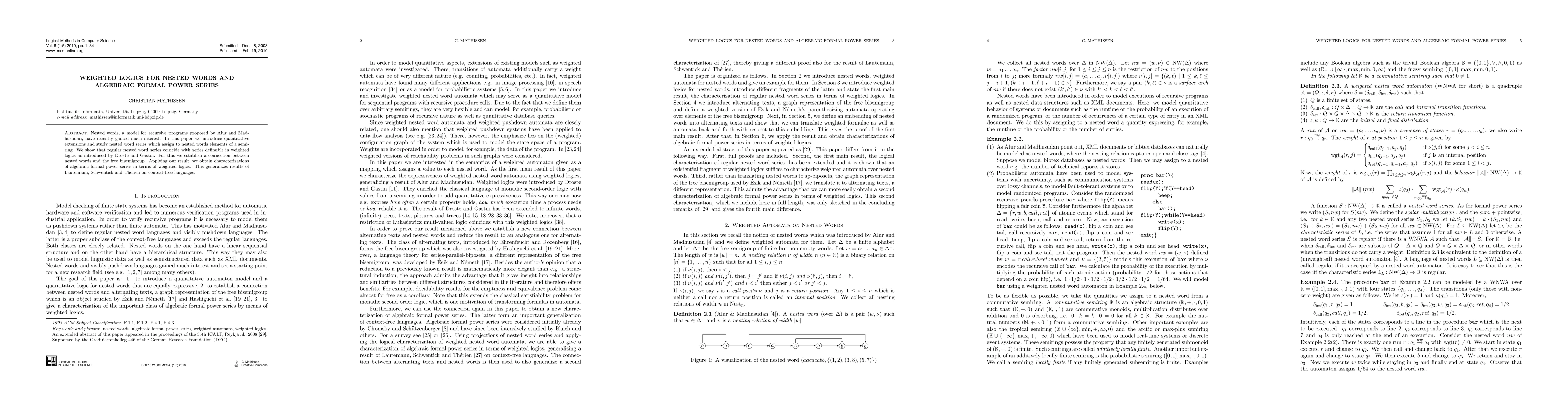 This paper introduces quantitative extensions of nested words, linking them to algebraic formal power series via weighted logics. It establishes that regular nested word series align with series definable in weighted logics, providing a generalization of previous results on context-free languages.