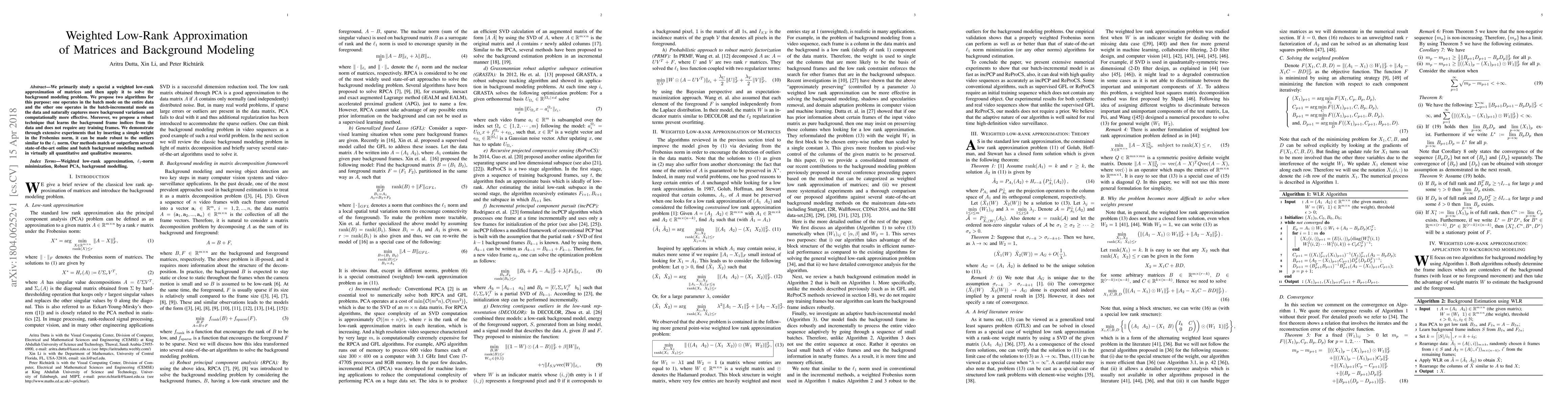 This paper proposes weighted low-rank approximation algorithms for background modeling, introducing two methods—one batch and one batch-incremental—that effectively capture background variations. The robust technique learns background frame indices directly from data without training frames, demonstrating improved performance against state-of-the-art methods.