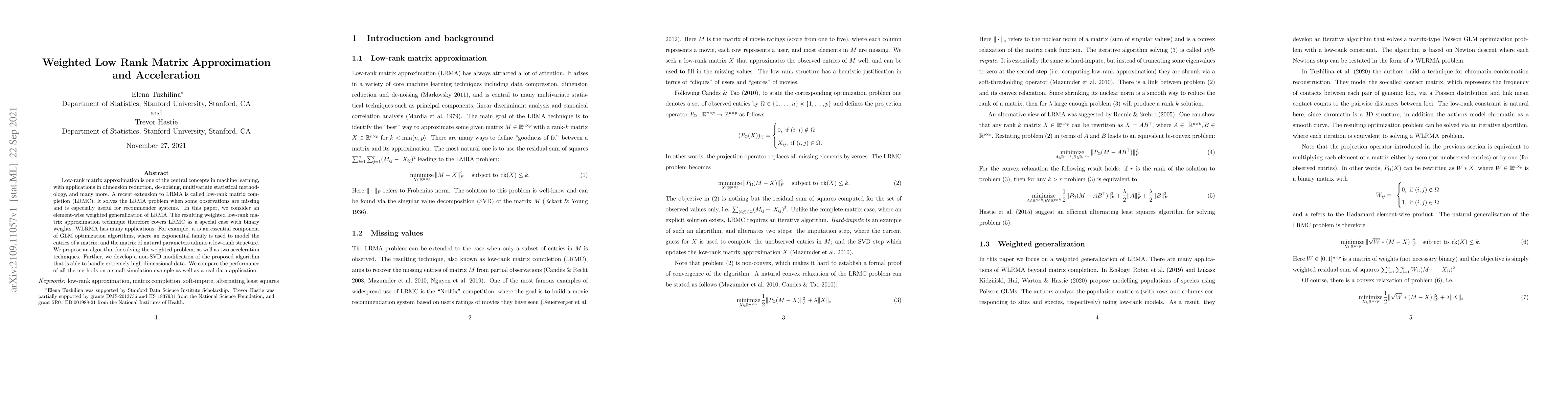 This paper introduces a weighted low-rank matrix approximation technique (WLRMA) that generalizes traditional low-rank matrix approximation, including low-rank matrix completion. It proposes an algorithm and two acceleration techniques for solving WLRMA, along with a non-SVD modification for handling high-dimensional data, and demonstrates performance on simulation and real-data examples.