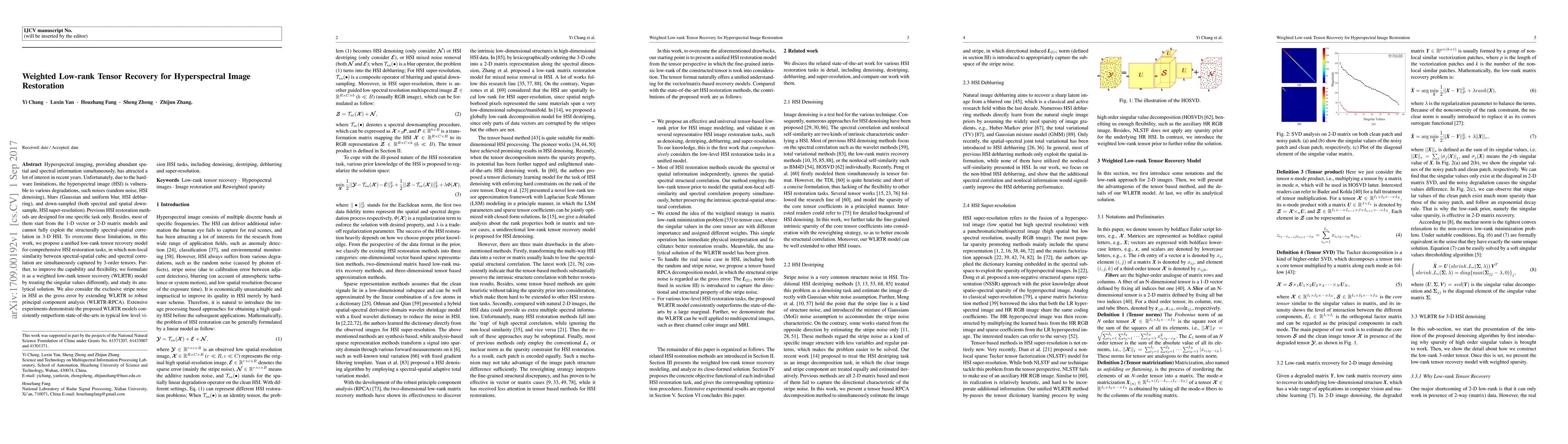 This paper proposes a weighted low-rank tensor recovery model for comprehensive hyperspectral image (HSI) restoration, addressing noise, blur, and downsampling. The model leverages 3-order tensors to capture spectral-spatial correlations and formulates it as a robust principal component analysis to handle gross errors, outperforming existing methods in denoising, deblurring, destriping, and super-resolution tasks.