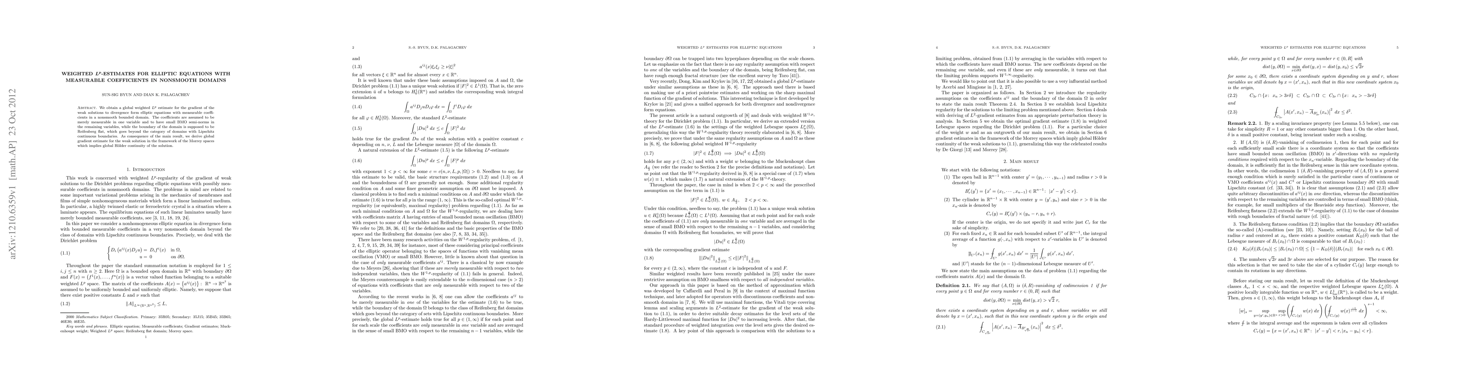 Summary: The paper establishes global weighted $L^p$ gradient estimates for weak solutions to elliptic equations with measurable coefficients in Reifenberg flat domains, extending beyond Lipschitz boundaries, and demonstrates global H\"older continuity of solutions via Morrey spaces.