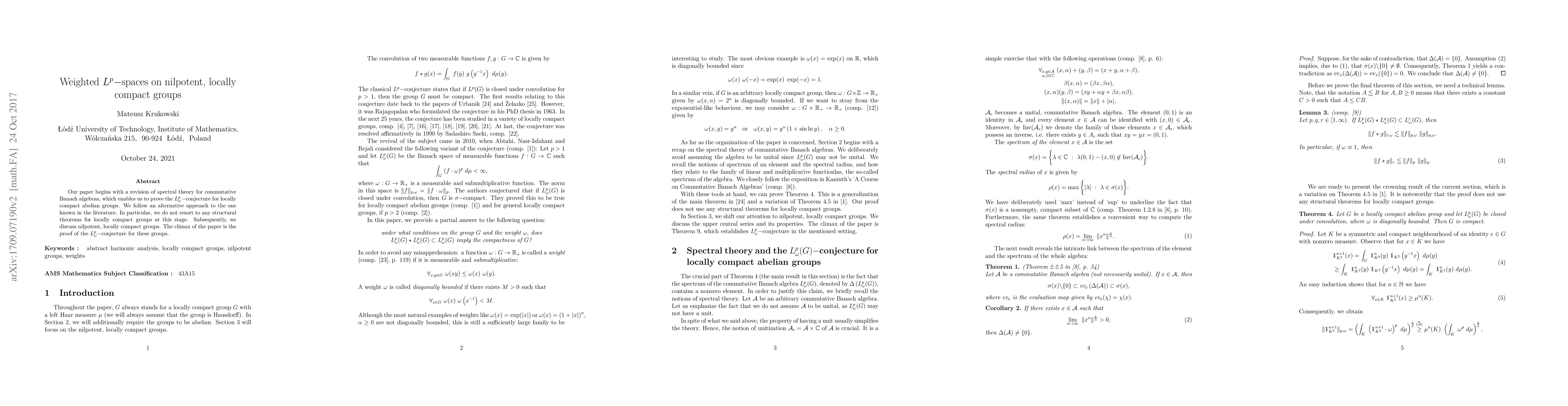 Our paper begins with a revision of spectral theory for commutative Banach algebras, which enables us to prove the $L^p_{\omega}-$conjecture for locally compact abelian groups. We follow an alternative approach to the one known in the literature. In particular, we do not resort to any structural theorems for locally compact groups. Subsequently, we discuss nilpotent, locally compact groups. The climax of the paper is the proof of the $L^p_{\omega}-$conjecture for these groups.