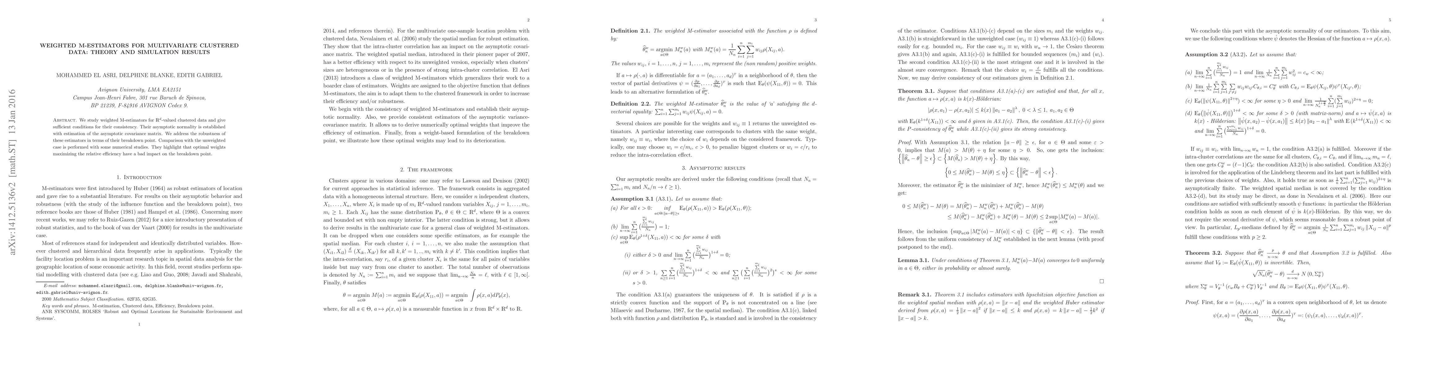 We study weighted M-estimators for $\mathbb{R}^d$-valued clustered data and give sufficient conditions for their consistency. Their asymptotic normality is established with estimation of the asymptotic covariance matrix. We address the robustness of these estimators in terms of their breakdown point. Comparison with the unweighted case is performed with some numerical studies. They highlight that optimal weights maximizing the relative efficiency have a bad impact on the breakdown point.