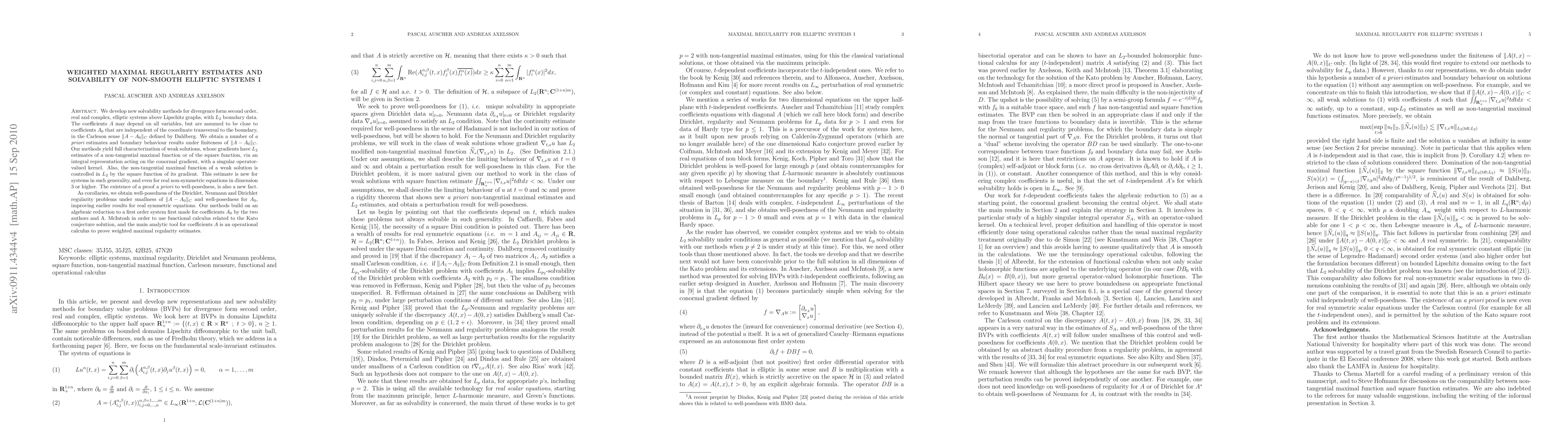 We develop new solvability methods for divergence form second order, real and complex, elliptic systems above Lipschitz graphs, with $L_2$ boundary data. The coefficients $A$ may depend on all variables, but are assumed to be close to coefficients $A_0$ that are independent of the coordinate transversal to the boundary, in the Carleson sense $\|A-A_0\|_C$ defined by Dahlberg. We obtain a number of {\em a priori} estimates and boundary behaviour results under finiteness of $\|A-A_0\|_C$. Our methods yield full characterization of weak solutions, whose gradients have $L_2$ estimates of a non-tangential maximal function or of the square function, via an integral representation acting on the conormal gradient, with a singular operator-valued kernel. Also, the non-tangential maximal function of a weak solution is controlled in $L_2$ by the square function of its gradient. This estimate is new for systems in such generality, and even for real non-symmetric equations in dimension 3 or higher. The existence of a proof {\em a priori} to well-posedness, is also a new fact. As corollaries, we obtain well-posedness of the Dirichlet, Neumann and Dirichlet regularity problems under smallness of $\|A-A_0\|_C$ and well-posedness for $A_0$, improving earlier results for real symmetric equations. Our methods build on an algebraic reduction to a first order system first made for coefficients $A_0$ by the two authors and A. McIntosh in order to use functional calculus related to the Kato conjecture solution, and the main analytic tool for coefficients $A$ is an operational calculus to prove weighted maximal regularity estimates.