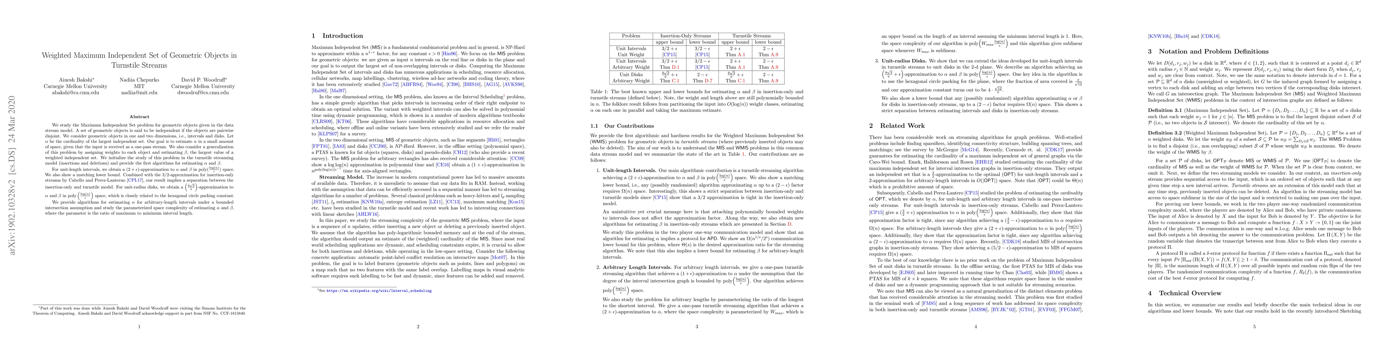 We study the Maximum Independent Set problem for geometric objects given in the data stream model. A set of geometric objects is said to be independent if the objects are pairwise disjoint. We consider geometric objects in one and two dimensions, i.e., intervals and disks. Let $\alpha$ be the cardinality of the largest independent set. Our goal is to estimate $\alpha$ in a small amount of space, given that the input is received as a one-pass stream. We also consider a generalization of this problem by assigning weights to each object and estimating $\beta$, the largest value of a weighted independent set. We initialize the study of this problem in the turnstile streaming model (insertions and deletions) and provide the first algorithms for estimating $\alpha$ and $\beta$. For unit-length intervals, we obtain a $(2+\epsilon)$-approximation to $\alpha$ and $\beta$ in poly$(\frac{\log(n)}{\epsilon})$ space. We also show a matching lower bound. Combined with the $3/2$-approximation for insertion-only streams by Cabello and Perez-Lanterno [CP15], our result implies a separation between the insertion-only and turnstile model. For unit-radius disks, we obtain a $\left(\frac{8\sqrt{3}}{\pi}\right)$-approximation to $\alpha$ and $\beta$ in poly$(\log(n), \epsilon^{-1})$ space, which is closely related to the hexagonal circle packing constant. We provide algorithms for estimating $\alpha$ for arbitrary-length intervals under a bounded intersection assumption and study the parameterized space complexity of estimating $\alpha$ and $\beta$, where the parameter is the ratio of maximum to minimum interval length.