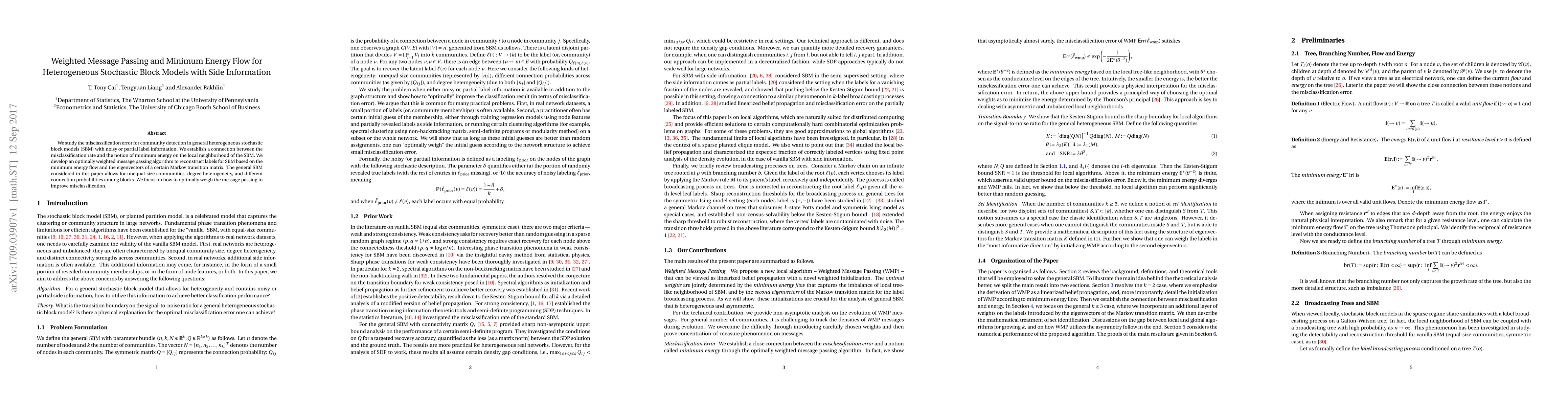 This paper investigates community detection in heterogeneous stochastic block models with side information, establishing a link between misclassification error and minimum energy flow. It proposes a weighted message passing algorithm that leverages minimum energy and Markov transition matrix eigenvectors to optimally reconstruct labels, addressing unequal-sized communities, degree heterogeneity, and varying connection probabilities.