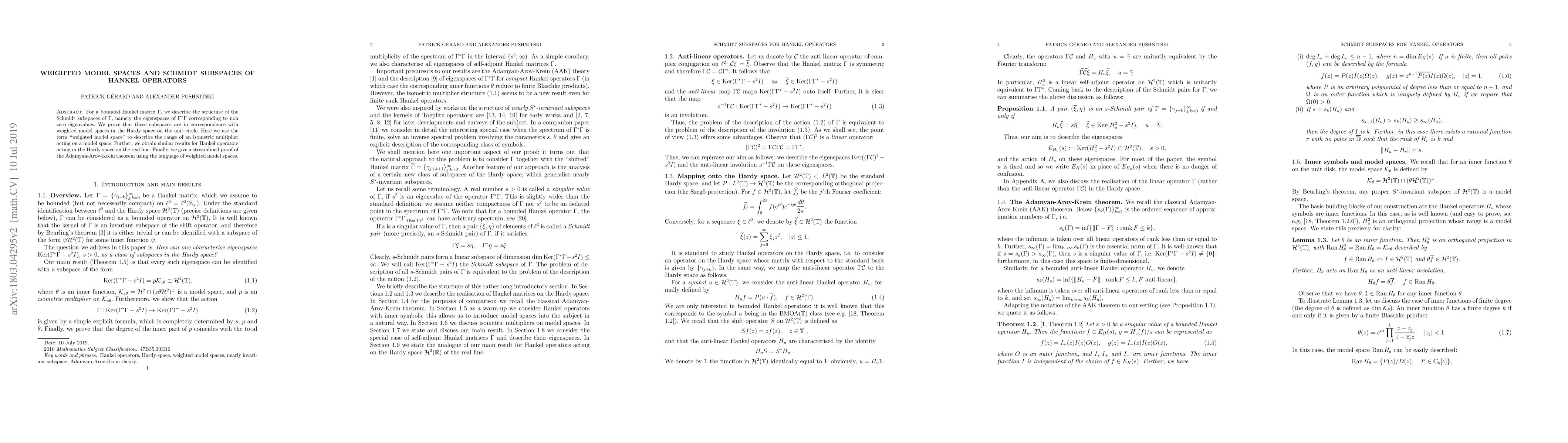 For a bounded Hankel matrix $\Gamma$, we describe the structure of the Schmidt subspaces of $\Gamma$, namely the eigenspaces of $\Gamma^* \Gamma$ corresponding to non zero eigenvalues. We prove that these subspaces are in correspondence with weighted model spaces in the Hardy space on the unit circle. Here we use the term "weighted model space" to describe the range of an isometric multiplier acting on a model space. Further, we obtain similar results for Hankel operators acting in the Hardy space on the real line. Finally, we give a streamlined proof of the Adamyan-Arov-Krein theorem using the language of weighted model spaces.