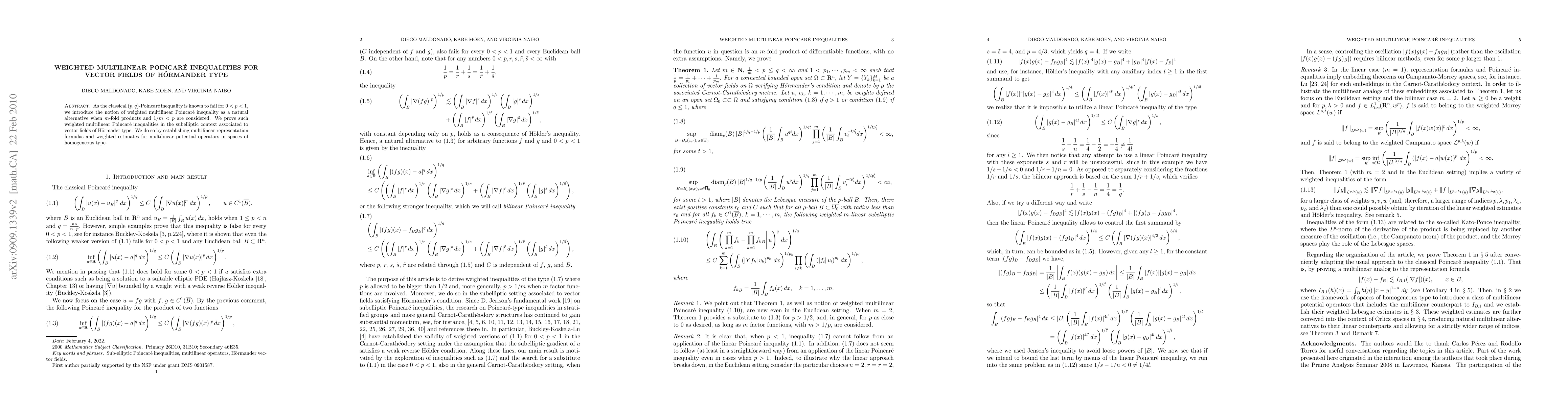 As the classical $(p,q)$-Poincar\'e inequality is known to fail for $0 < p < 1$, we introduce the notion of weighted multilinear Poincar\'e inequality as a natural alternative when $m$-fold products and $1/m < p$ are considered. We prove such weighted multilinear Poincar\'e inequalities in the subelliptic context associated to vector fields of H\"ormader type. We do so by establishing multilinear representation formulas and weighted estimates for multilinear potential operators in spaces of homogeneous type.