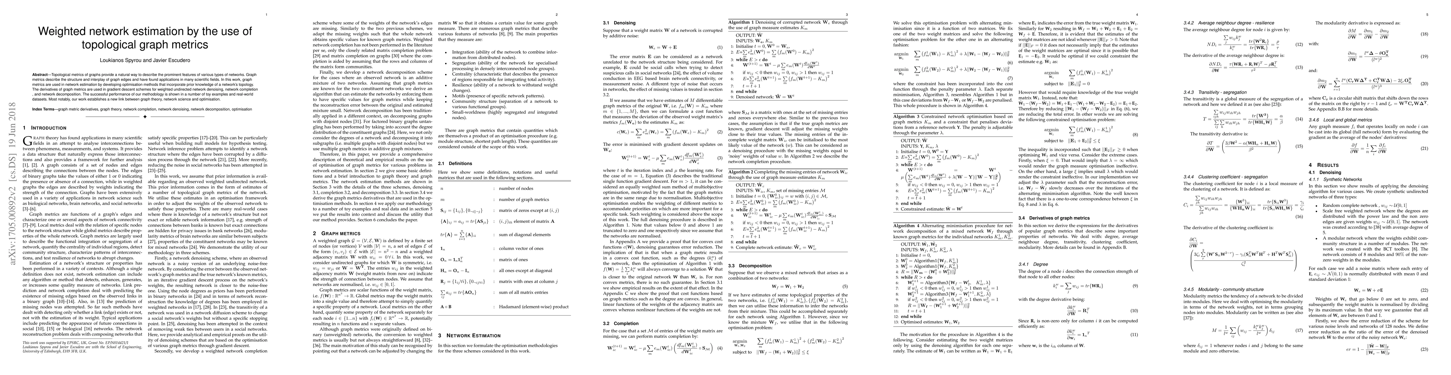 This paper develops optimization methods using topological graph metrics to estimate weighted networks, applying gradient descent for tasks like denoising, completion, and decomposition. The approach successfully integrates graph theory, network science, and optimization, demonstrated through both toy examples and real-world datasets.