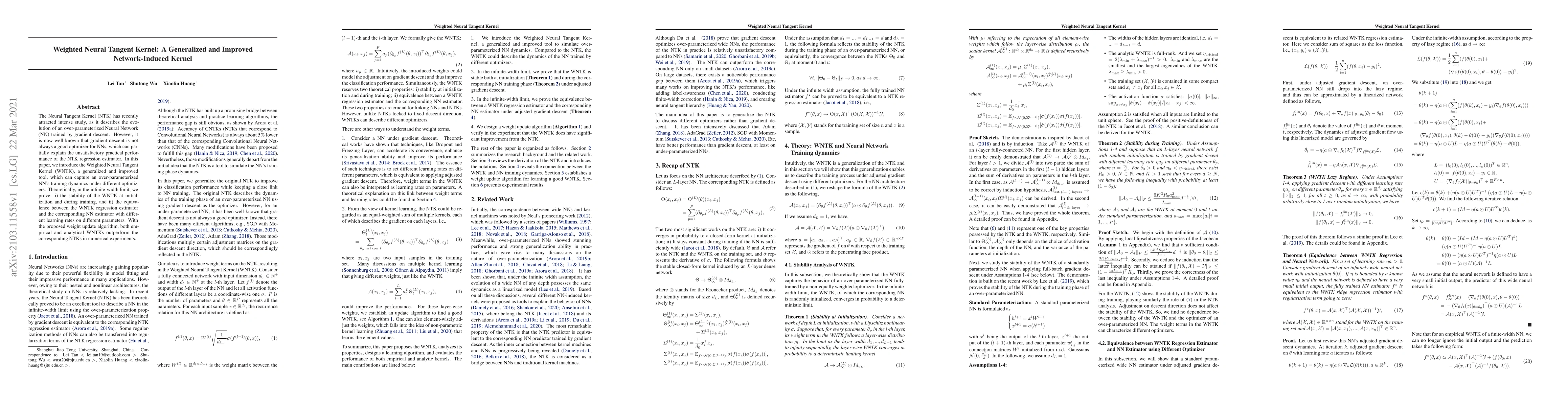The Neural Tangent Kernel (NTK) has recently attracted intense study, as it describes the evolution of an over-parameterized Neural Network (NN) trained by gradient descent. However, it is now well-known that gradient descent is not always a good optimizer for NNs, which can partially explain the unsatisfactory practical performance of the NTK regression estimator. In this paper, we introduce the Weighted Neural Tangent Kernel (WNTK), a generalized and improved tool, which can capture an over-parameterized NN's training dynamics under different optimizers. Theoretically, in the infinite-width limit, we prove: i) the stability of the WNTK at initialization and during training, and ii) the equivalence between the WNTK regression estimator and the corresponding NN estimator with different learning rates on different parameters. With the proposed weight update algorithm, both empirical and analytical WNTKs outperform the corresponding NTKs in numerical experiments.