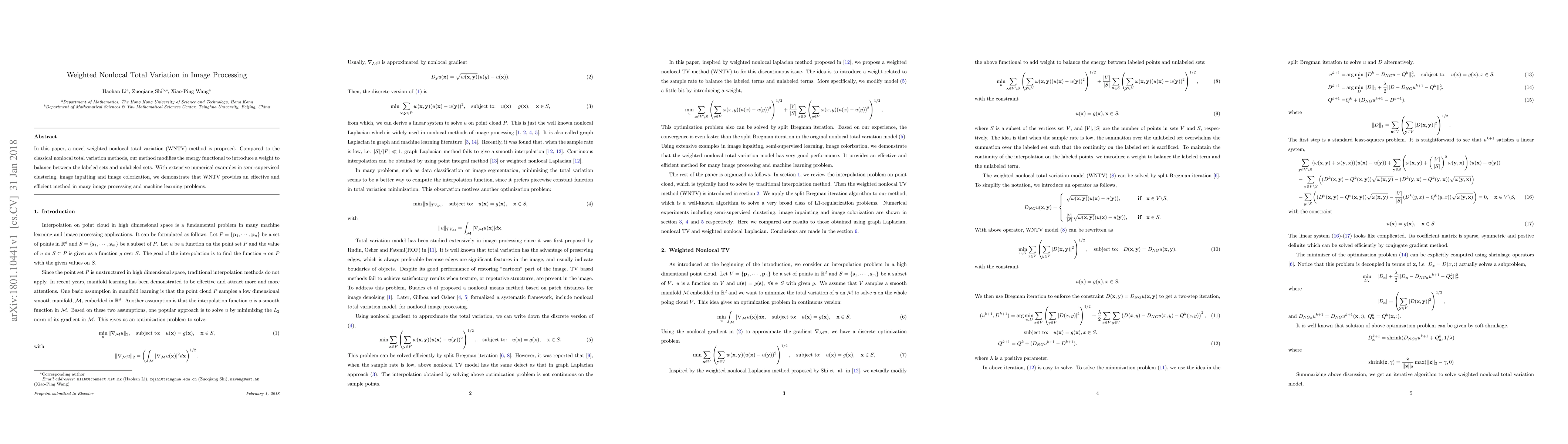 This paper introduces a weighted nonlocal total variation (WNTV) method to balance labeled and unlabeled sets in image processing tasks. The proposed method demonstrates improved efficiency and effectiveness in semi-supervised clustering, image inpainting, and image colorization.