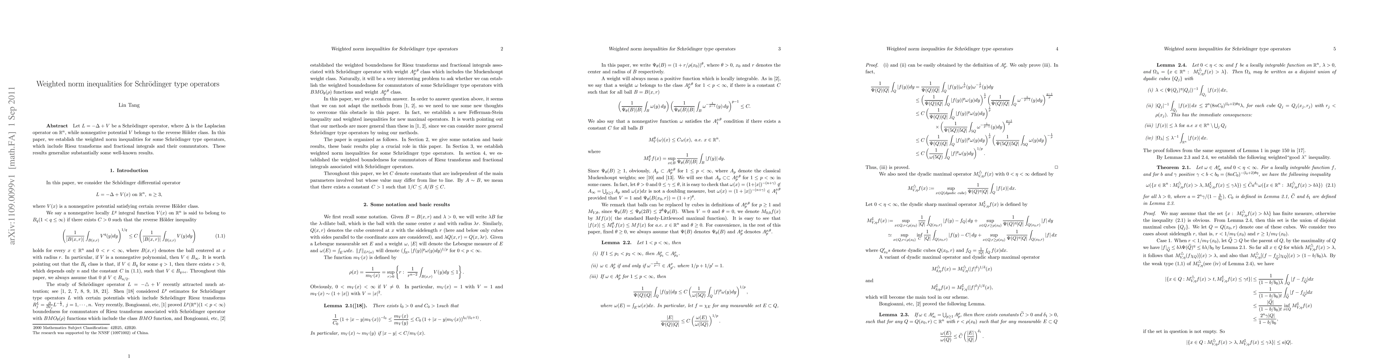 This paper establishes weighted norm inequalities for Schrödinger type operators, including Riesz transforms and fractional integrals, under a reverse Hölder class potential. The results generalize existing well-known inequalities.