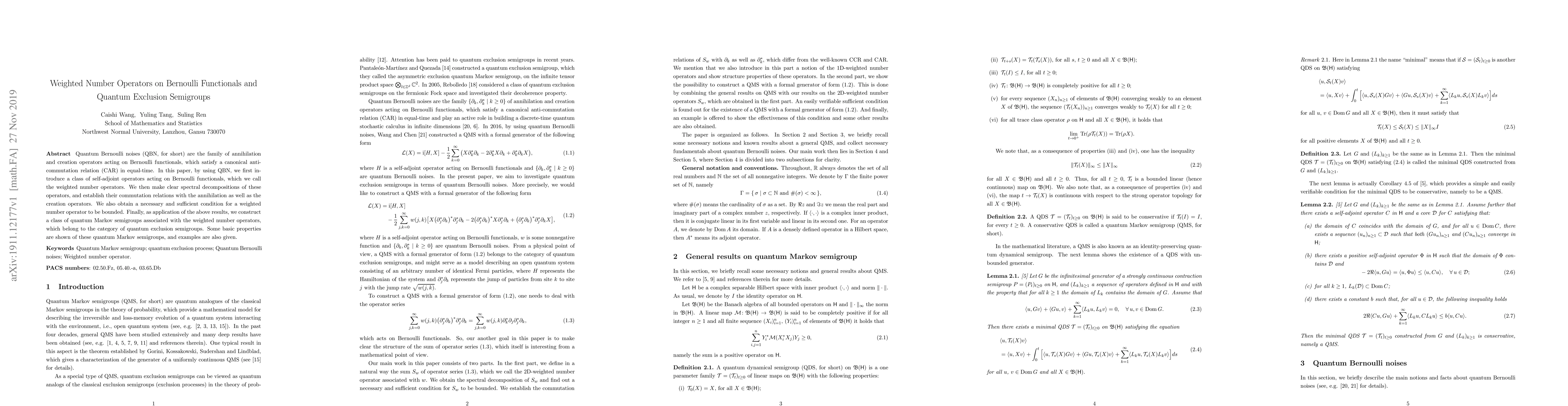 This paper introduces weighted number operators on Bernoulli functionals using quantum Bernoulli noises, establishes their spectral decompositions and commutation relations, and provides conditions for boundedness. It also constructs quantum Markov semigroups associated with these operators, categorizing them as quantum exclusion semigroups.