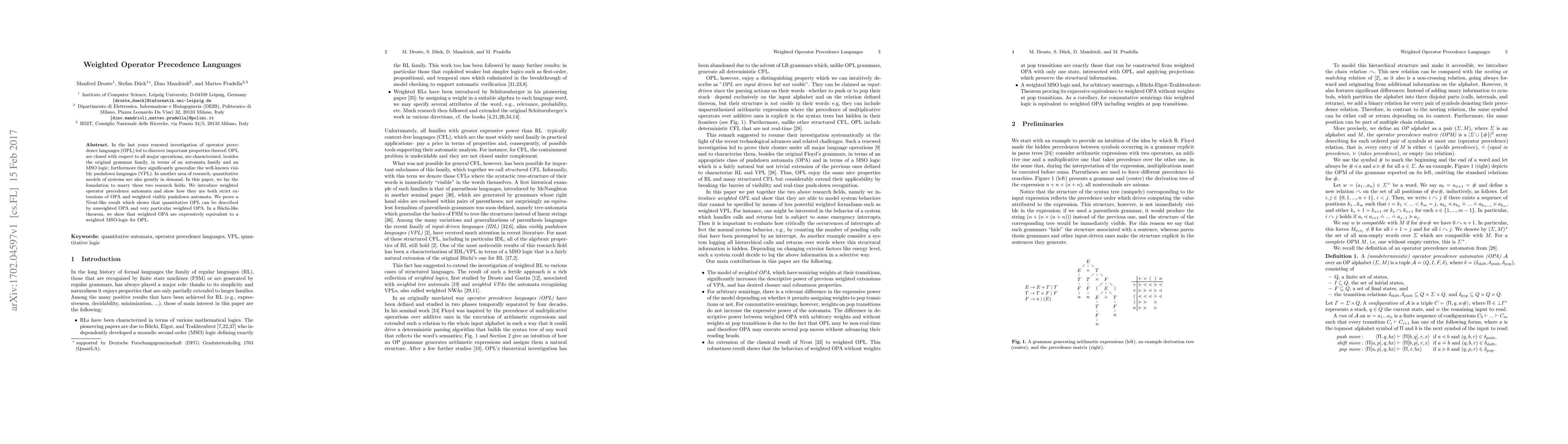 In the last years renewed investigation of operator precedence languages (OPL) led to discover important properties thereof: OPL are closed with respect to all major operations, are characterized, besides the original grammar family, in terms of an automata family and an MSO logic; furthermore they significantly generalize the well-known visibly pushdown languages (VPL). In another area of research, quantitative models of systems are also greatly in demand. In this paper, we lay the foundation to marry these two research fields. We introduce weighted operator precedence automata and show how they are both strict extensions of OPA and weighted visibly pushdown automata. We prove a Nivat-like result which shows that quantitative OPL can be described by unweighted OPA and very particular weighted OPA. In a B\"uchi-like theorem, we show that weighted OPA are expressively equivalent to a weighted MSO-logic for OPL.