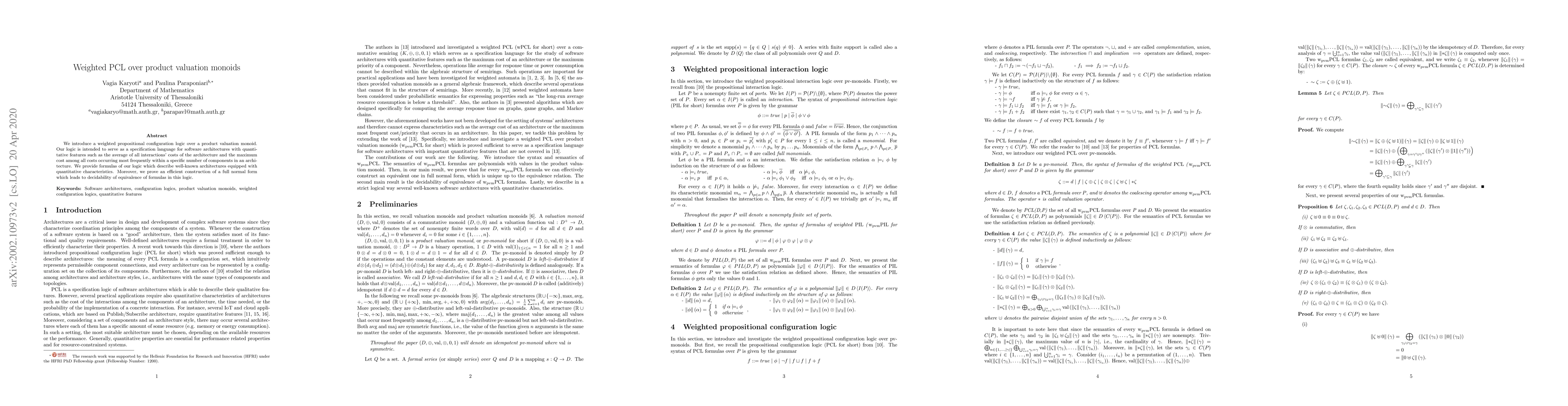 We introduce a weighted propositional configuration logic over a product valuation monoid. Our logic is intended to serve as a specification language for software architectures with quantitative features such as the average of all interactions' costs of the architecture and the maximum cost among all costs occurring most frequently within a specific number of components in an architecture. We provide formulas of our logic which describe well-known architectures equipped with quantitative characteristics. Moreover, we prove an efficient construction of a full normal form which leads to decidability of equivalence of formulas in this logic.
