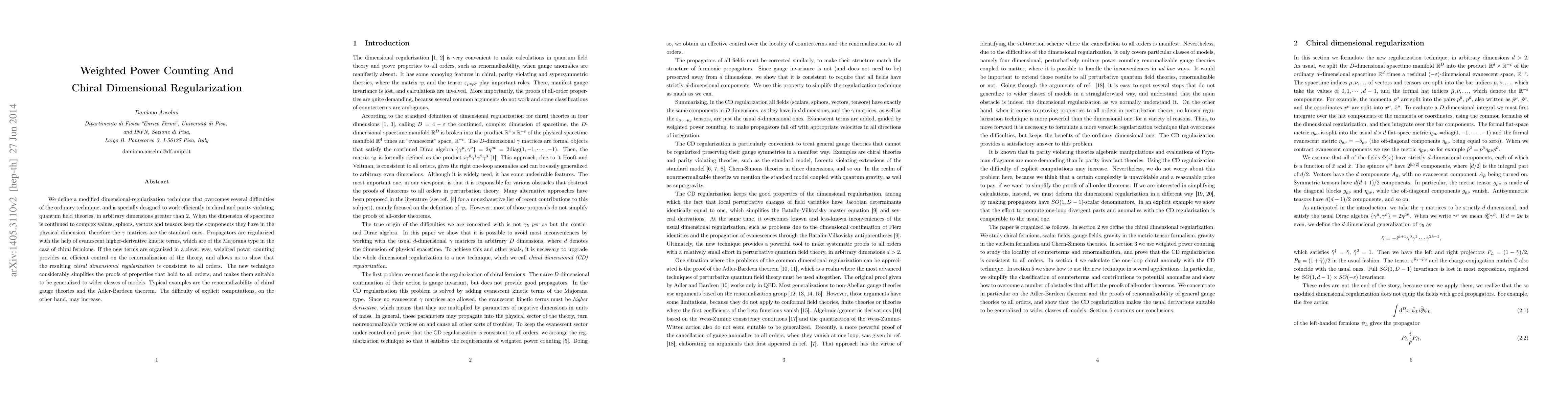We define a modified dimensional-regularization technique that overcomes several difficulties of the ordinary technique, and is specially designed to work efficiently in chiral and parity violating quantum field theories, in arbitrary dimensions greater than 2. When the dimension of spacetime is continued to complex values, spinors, vectors and tensors keep the components they have in the physical dimension, therefore the $\gamma $ matrices are the standard ones. Propagators are regularized with the help of evanescent higher-derivative kinetic terms, which are of the Majorana type in the case of chiral fermions. If the new terms are organized in a clever way, weighted power counting provides an efficient control on the renormalization of the theory, and allows us to show that the resulting chiral dimensional regularization is consistent to all orders. The new technique considerably simplifies the proofs of properties that hold to all orders, and makes them suitable to be generalized to wider classes of models. Typical examples are the renormalizability of chiral gauge theories and the Adler-Bardeen theorem. The difficulty of explicit computations, on the other hand, may increase.
