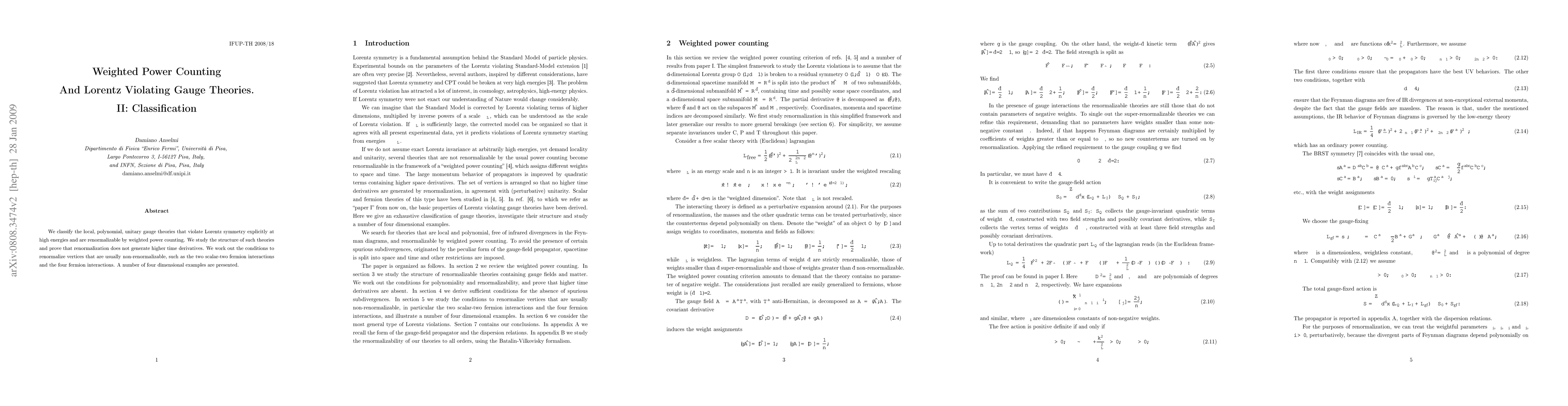 This paper classifies renormalizable, unitary gauge theories that explicitly violate Lorentz symmetry at high energies using weighted power counting. It demonstrates that such theories do not generate higher time derivatives and provides conditions for renormalizing typically non-renormalizable vertices, including two scalar-two fermion and four fermion interactions.