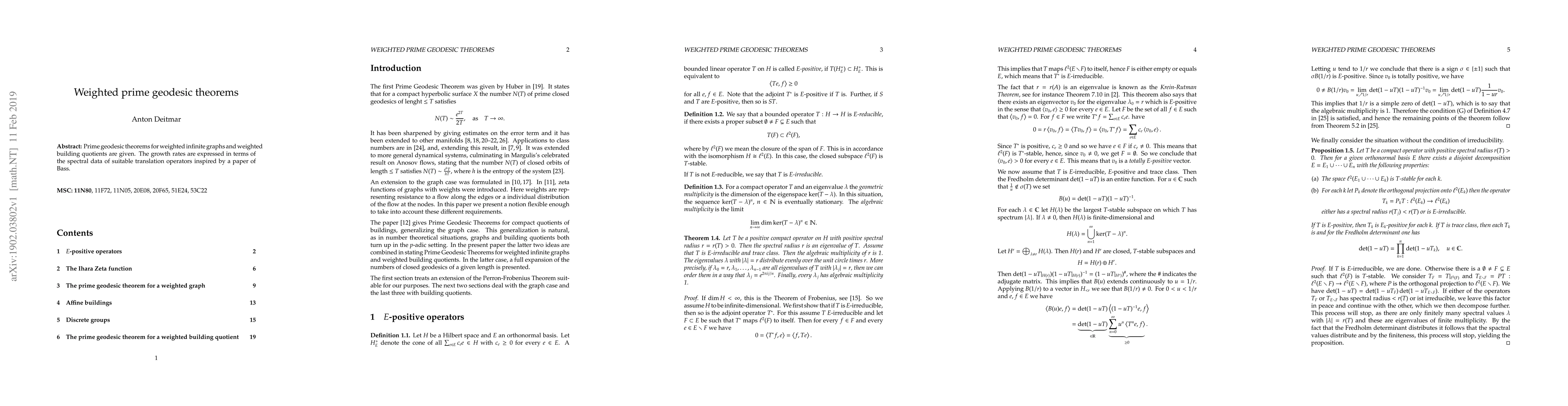 The paper establishes prime geodesic theorems for weighted infinite graphs and building quotients, providing growth rates based on spectral data of translation operators.