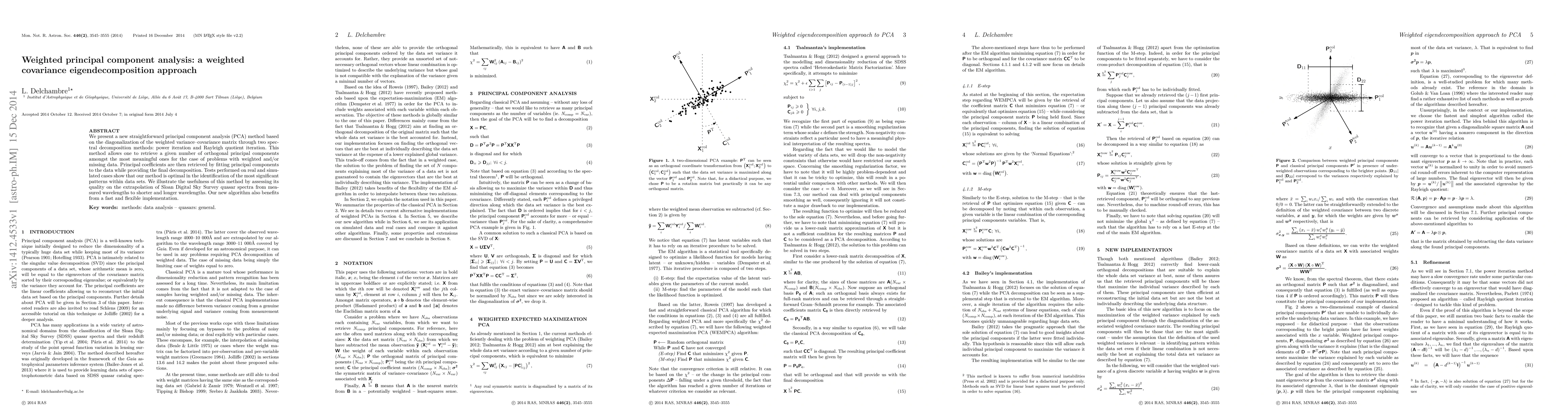 This paper introduces a weighted PCA method based on the diagonalization of a weighted variance-covariance matrix using power and Rayleigh quotient iterations. The proposed approach is optimal for identifying significant patterns in datasets with weighted and/or missing data, demonstrated through its application in extrapolating quasar spectra.