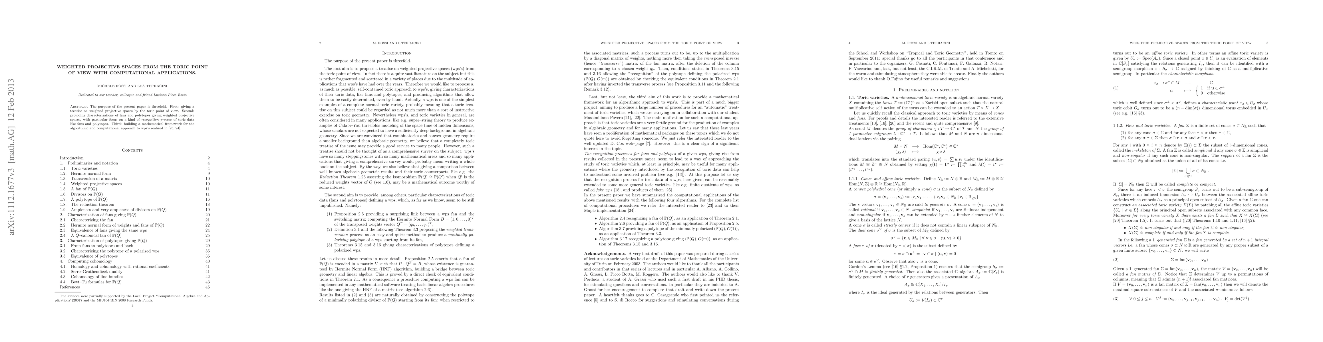 The purpose of the present paper is threefold. First: giving a treatise on weighted projective spaces by the toric point of view. Second: providing characterizations of fans and polytopes giving weighted projective spaces, with particular focus on a kind of \emph{recognition process} of toric data like fans and polytopes. Third: building a mathematical framework for the algorithmic and computational approach to wps's realized in [23,24].
