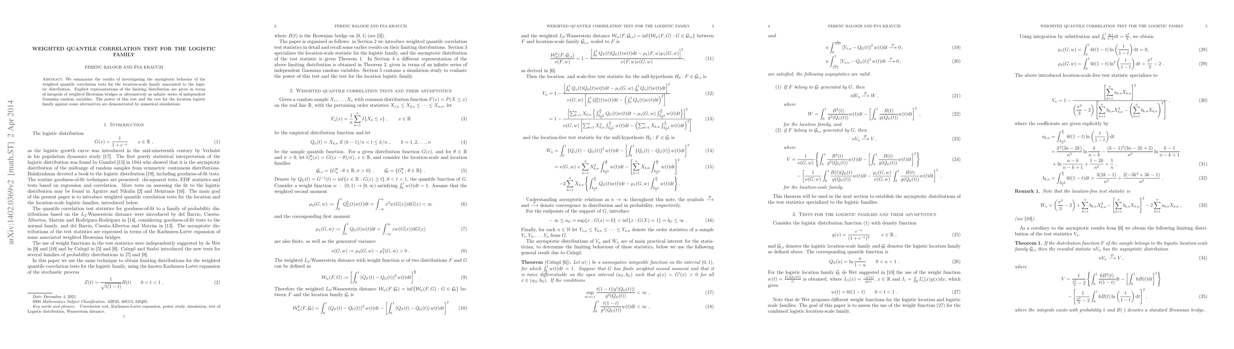 We summarize the results of investigating the asymptotic behavior of the weighted quantile correlation tests for the location-scale family associated to the logistic distribution. Explicit representations of the limiting distribution are given in terms of integrals of weighted Brownian bridges or alternatively as infinite series of independent Gaussian random variables. The power of this test and the test for the location logistic family against some alternatives are demonstrated by numerical simulations.