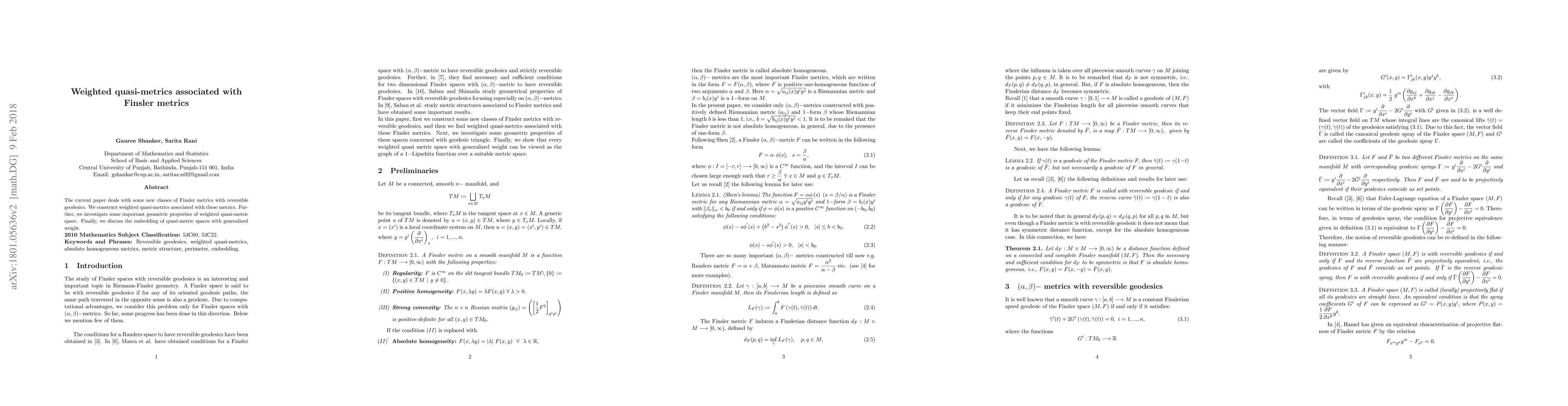 This paper introduces new classes of reversible Finsler metrics and constructs associated weighted quasi-metrics. It explores geometric properties of the resulting weighted quasi-metric spaces and discusses embedding techniques for these spaces with generalized weights.