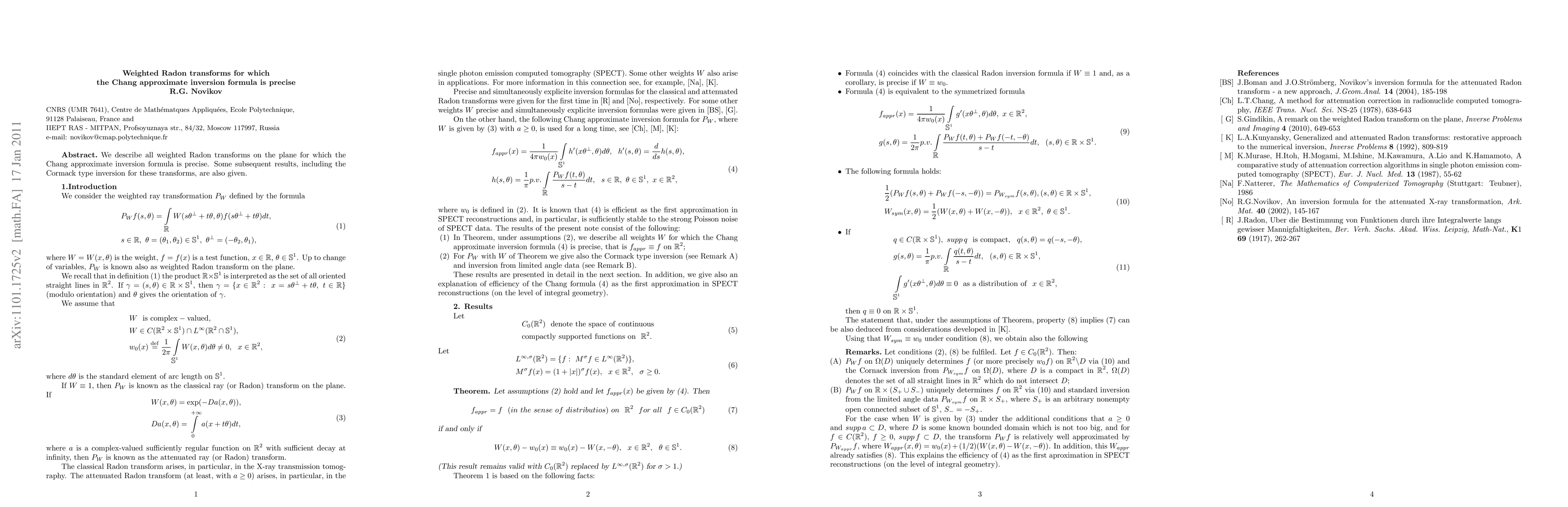 We describe all weighted Radon transforms on the plane for which the Chang approximate inversion formula is precise. Some subsequent results, including the Cormack type inversion for these transforms, are also given.