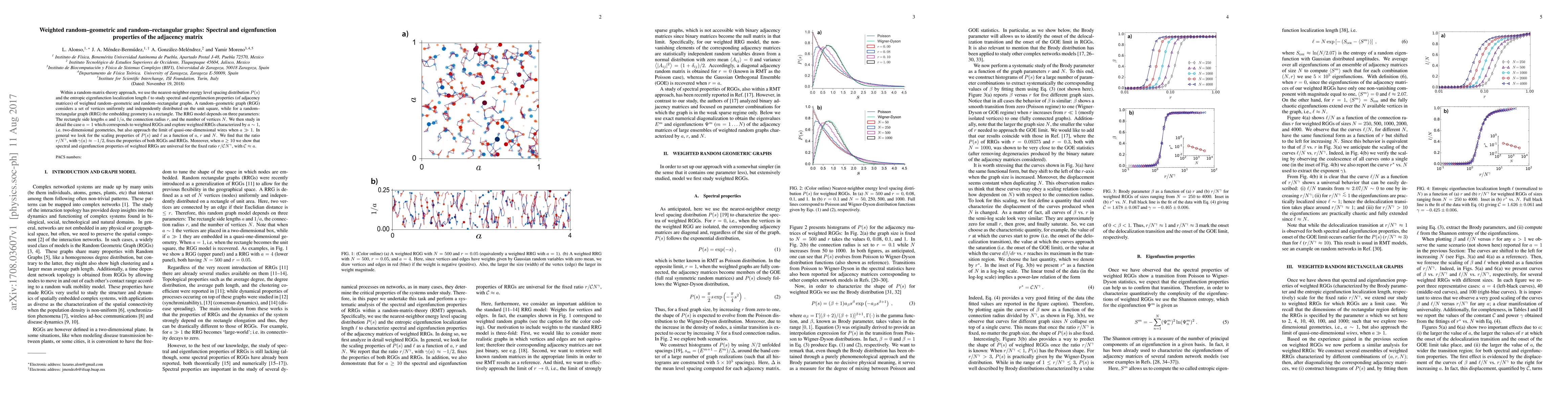 Within a random-matrix-theory approach, we use the nearest-neighbor energy level spacing distribution $P(s)$ and the entropic eigenfunction localization length $\ell$ to study spectral and eigenfunction properties (of adjacency matrices) of weighted random--geometric and random--rectangular graphs. A random--geometric graph (RGG) considers a set of vertices uniformly and independently distributed on the unit square, while for a random--rectangular graph (RRG) the embedding geometry is a rectangle. The RRG model depends on three parameters: The rectangle side lengths $a$ and $1/a$, the connection radius $r$, and the number of vertices $N$. We then study in detail the case $a=1$ which corresponds to weighted RGGs and explore weighted RRGs characterized by $a\sim 1$, i.e.~two-dimensional geometries, but also approach the limit of quasi-one-dimensional wires when $a\gg1$. In general we look for the scaling properties of $P(s)$ and $\ell$ as a function of $a$, $r$ and $N$. We find that the ratio $r/N^\gamma$, with $\gamma(a)\approx -1/2$, fixes the properties of both RGGs and RRGs. Moreover, when $a\ge 10$ we show that spectral and eigenfunction properties of weighted RRGs are universal for the fixed ratio $r/{\cal C}N^\gamma$, with ${\cal C}\approx a$.
