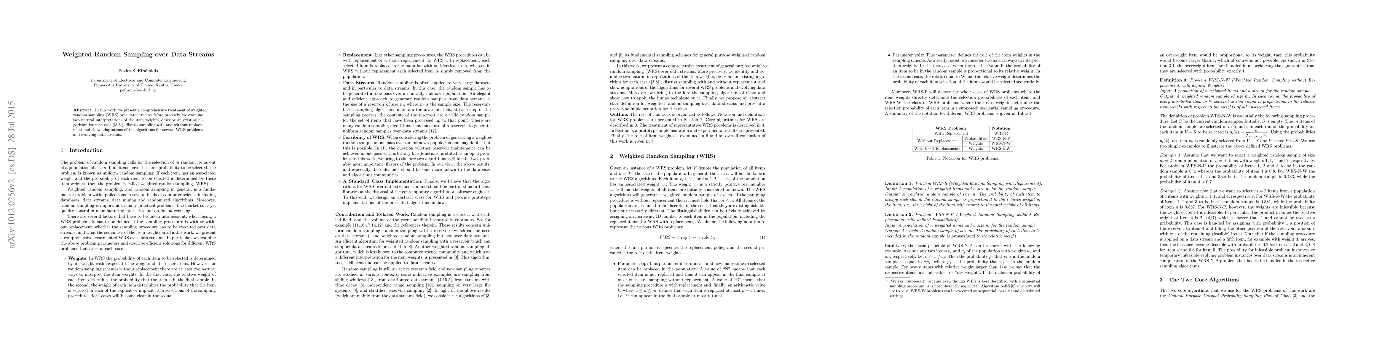 The paper presents a comprehensive analysis of Weighted Random Sampling (WRS) over data streams, examining two interpretations of item weights and discussing sampling with and without replacement. It adapts algorithms for various WRS problems and evolving data streams.