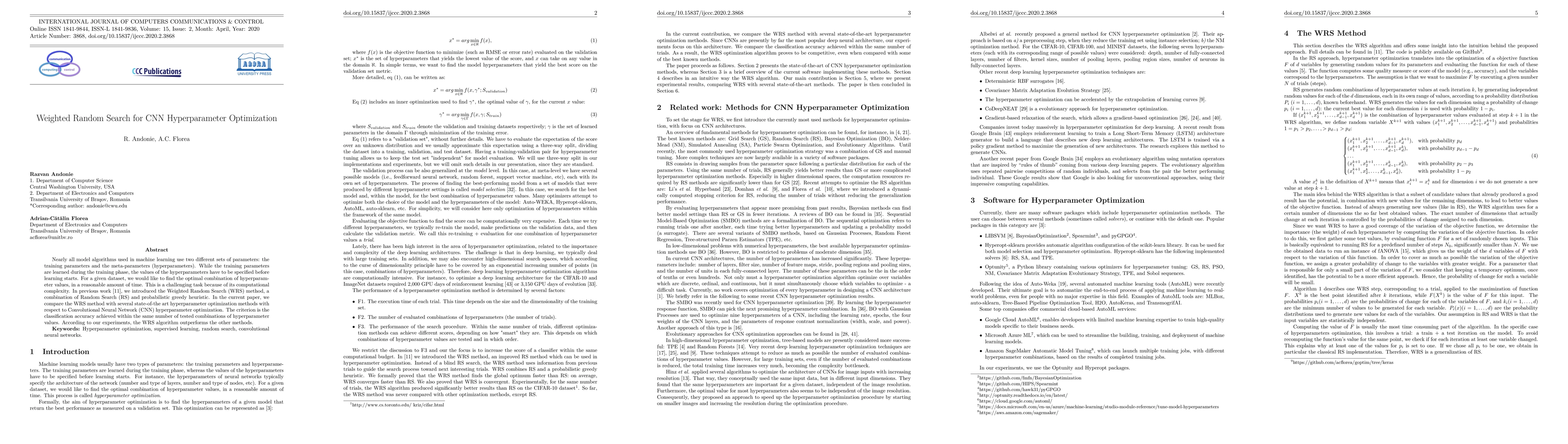 This research paper explores the Weighted Random Search (WRS) method for optimizing hyperparameters in Convolutional Neural Networks (CNNs). The study compares WRS against other state-of-the-art methods, focusing on classification accuracy within a fixed number of hyperparameter combinations. The results indicate that WRS achieves superior performance. For detailed insights, refer to the full paper.