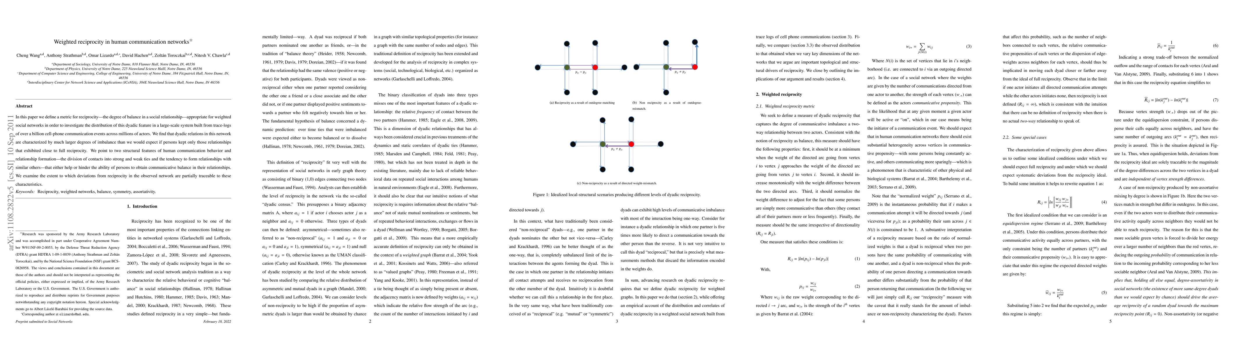 This paper introduces a metric for reciprocity in weighted social networks and applies it to a large-scale communication network from cell-phone data. It finds significant imbalance in relationships, attributing this to the division of contacts into strong and weak ties and the tendency to form relationships with similar individuals.