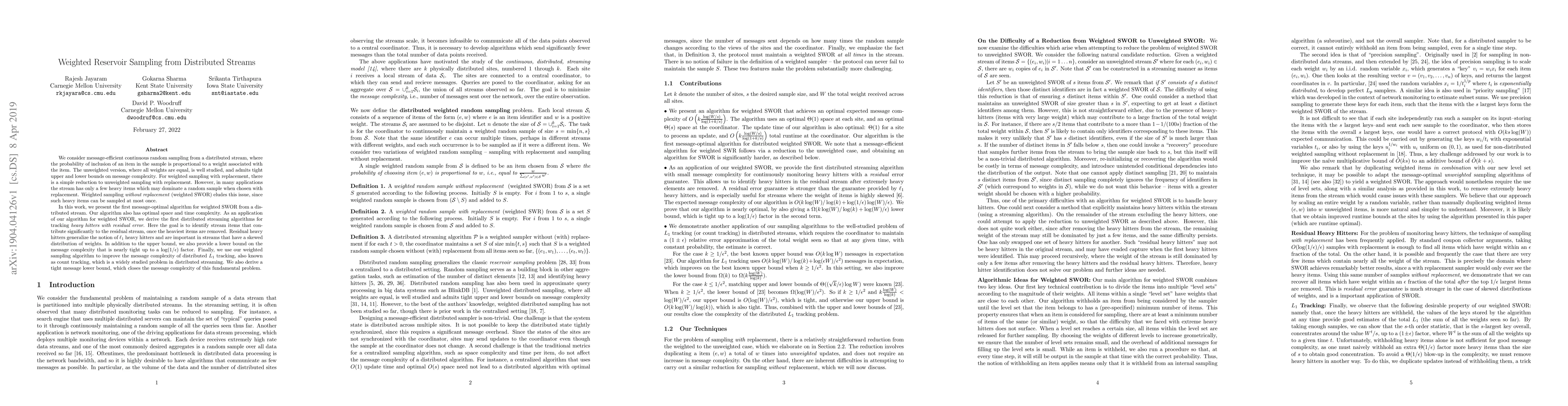 This paper presents a message-optimal algorithm for weighted sampling without replacement (weighted SWOR) from distributed streams, achieving optimal space and time complexity. It also introduces distributed streaming algorithms for tracking heavy hitters with residual error, improving the message complexity of distributed $L_1$ tracking and providing a nearly tight lower bound on message complexity for both problems.
