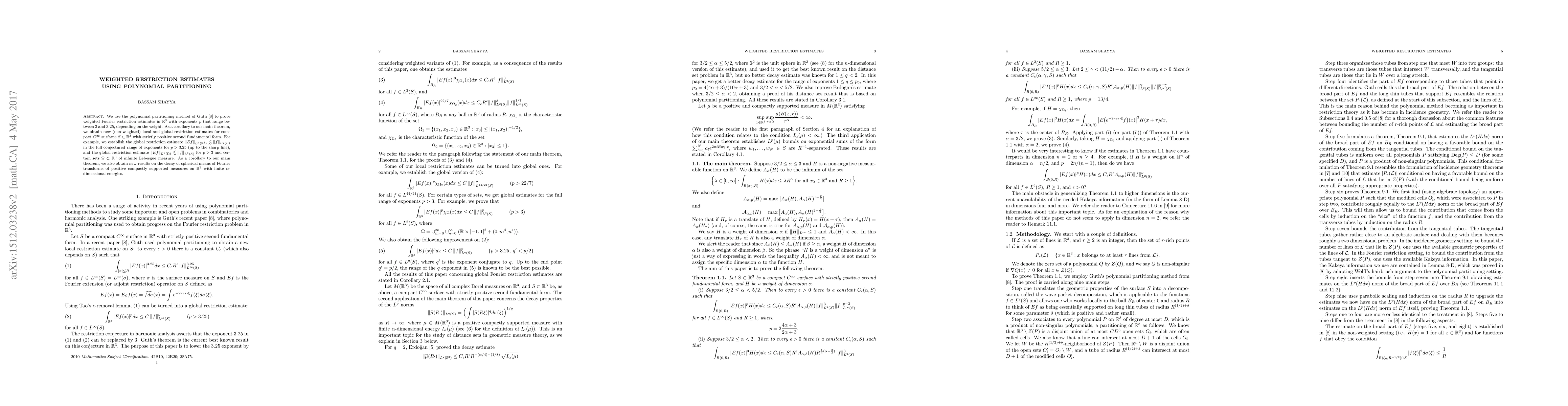 This paper leverages Guth's polynomial partitioning technique to prove weighted Fourier restriction estimates in $\Bbb R^3$ for $p$ between 3 and 3.25. It also yields new local and global restriction estimates for smooth surfaces in $\Bbb R^3$, including decay results for spherical means of Fourier transforms of certain measures.