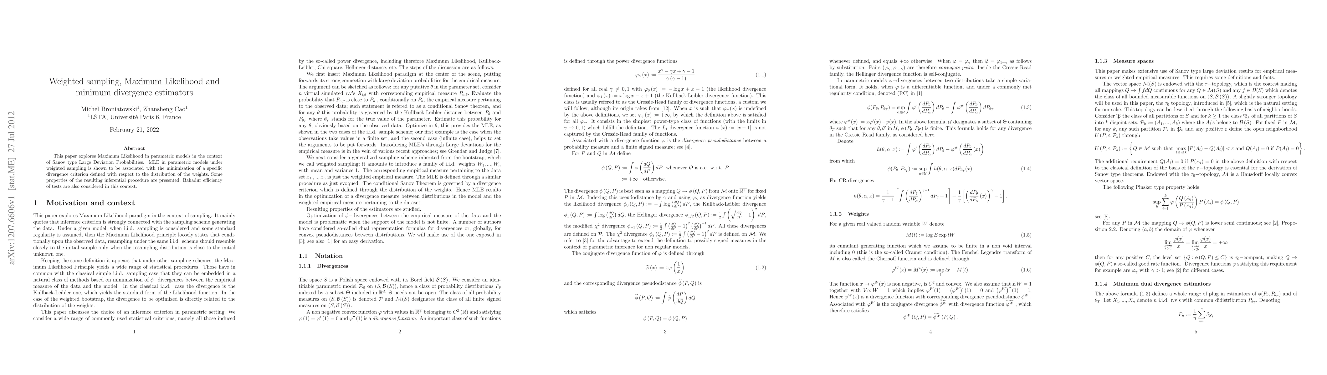 This paper investigates Maximum Likelihood Estimation (MLE) in parametric models under weighted sampling, linking it to the minimization of a divergence criterion. It also examines the Bahadur efficiency of tests derived from this inferential procedure.