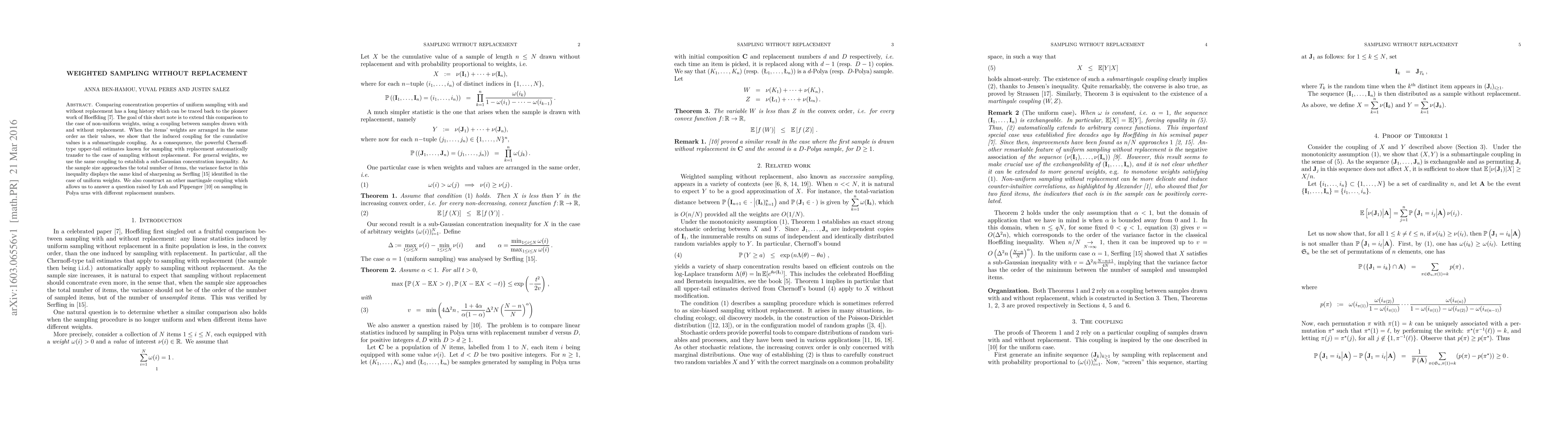 This paper compares concentration properties of uniform and non-uniform weighted sampling with and without replacement, using a coupling method. It demonstrates that for ordered weights, the induced coupling is a submartingale, transferring Chernoff-type upper-tail estimates from with replacement to without replacement sampling. For general weights, it establishes a sub-Gaussian concentration inequality and addresses a question on sampling in Polya urns with different replacement numbers.