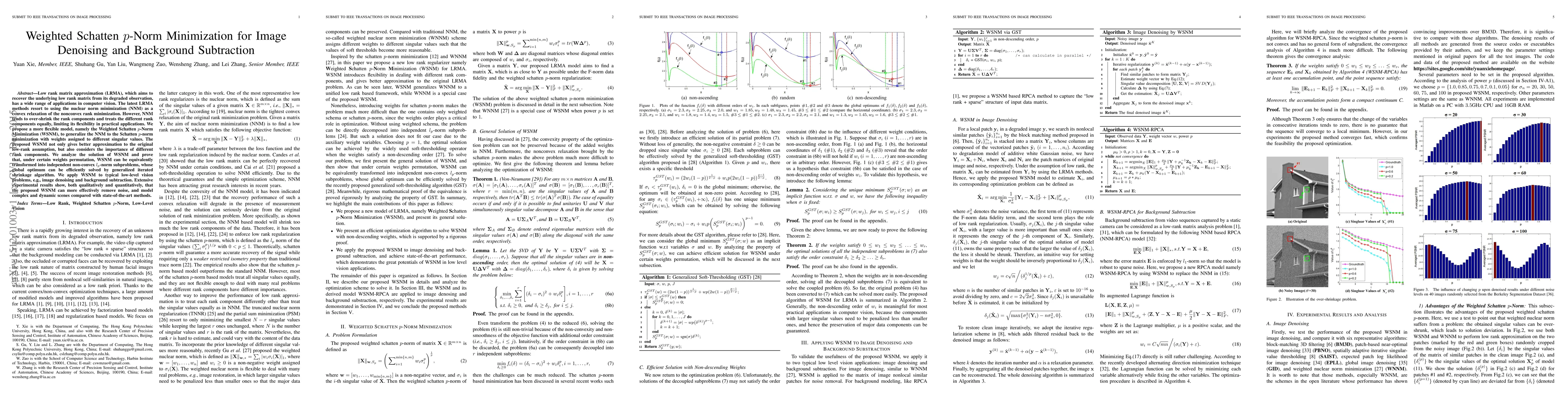 This paper proposes Weighted Schatten $p$-Norm Minimization (WSNM) to improve low rank matrix approximation for image denoising and background subtraction. WSNM generalizes nuclear norm minimization by assigning weights to different singular values, offering better flexibility and performance compared to existing methods.
