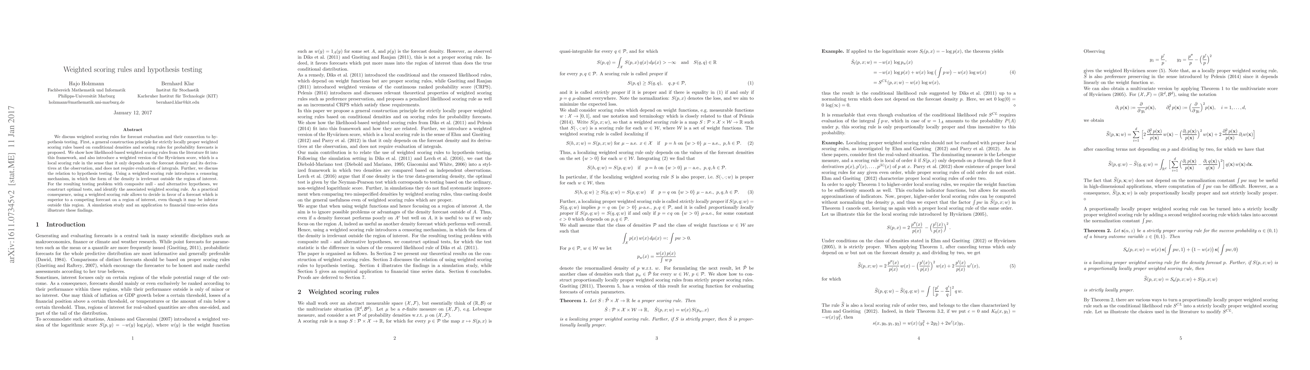 We discuss weighted scoring rules for forecast evaluation and their connection to hypothesis testing. First, a general construction principle for strictly locally proper weighted scoring rules based on conditional densities and scoring rules for probability forecasts is proposed. We show how likelihood-based weighted scoring rules from the literature fit into this framework, and also introduce a weighted version of the Hyv\"arinen score, which is a local scoring rule in the sense that it only depends on the forecast density and its derivatives at the observation, and does not require evaluation of integrals. Further, we discuss the relation to hypothesis testing. Using a weighted scoring rule introduces a censoring mechanism, in which the form of the density is irrelevant outside the region of interest. For the resulting testing problem with composite null - and alternative hypotheses, we construct optimal tests, and identify the associated weighted scoring rule. As a practical consequence, using a weighted scoring rule allows to decide in favor of a forecast which is superior to a competing forecast on a region of interest, even though it may be inferior outside this region. A simulation study and an application to financial time-series data illustrate these findings.