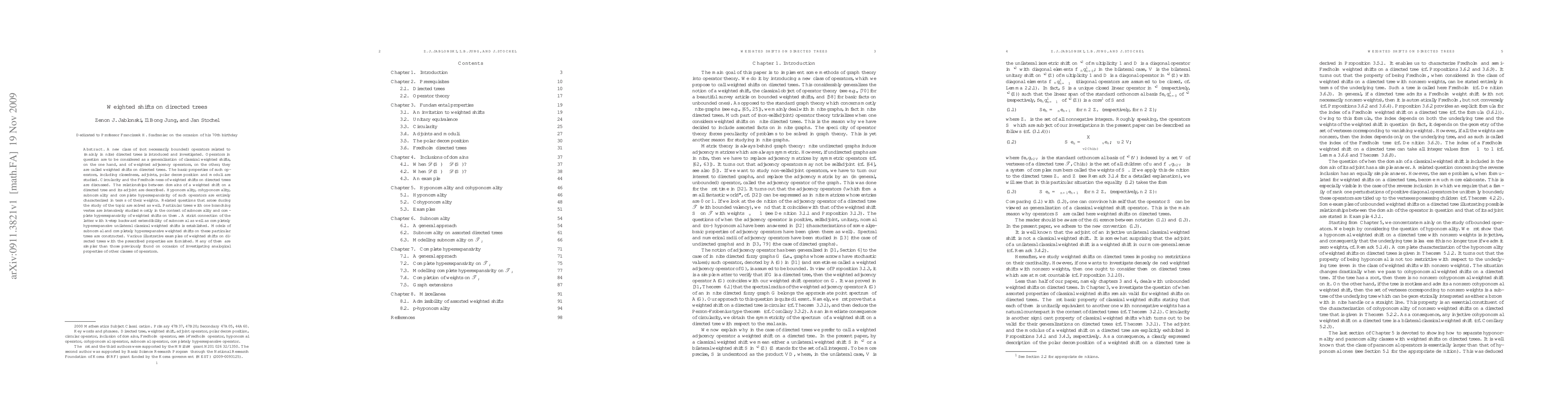 A new class of (not necessarily bounded) operators related to (mainly infinite) directed trees is introduced and investigated. Operators in question are to be considered as a generalization of classical weighted shifts, on the one hand, and of weighted adjacency operators, on the other; they are called weighted shifts on directed trees. The basic properties of such operators, including closedness, adjoints, polar decomposition and moduli are studied. Circularity and the Fredholmness of weighted shifts on directed trees are discussed. The relationships between domains of a weighted shift on a directed tree and its adjoint are described. Hyponormality, cohyponormality, subnormality and complete hyperexpansivity of such operators are entirely characterized in terms of their weights. Related questions that arose during the study of the topic are solved as well. Particular trees with one branching vertex are intensively studied mostly in the context of subnormality and complete hyperexpansivity of weighted shifts on them. A strict connection of the latter with $k$-step backward extendibility of subnormal as well as completely hyperexpansive unilateral classical weighted shifts is established. Models of subnormal and completely hyperexpansive weighted shifts on these particular trees are constructed. Various illustrative examples of weighted shifts on directed trees with the prescribed properties are furnished. Many of them are simpler than those previously found on occasion of investigating analogical properties of other classes of operators.