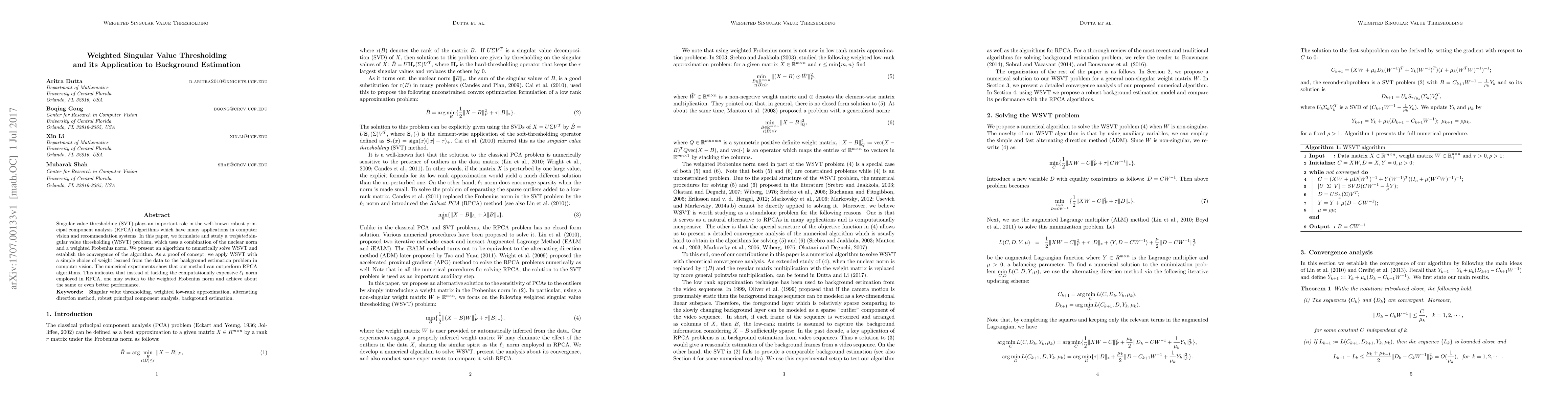 This paper introduces weighted singular value thresholding (WSVT) as an alternative to robust principal component analysis (RPCA) for background estimation in computer vision. The proposed WSVT method combines the nuclear norm with a weighted Frobenius norm, and an algorithm is developed to solve it, demonstrating convergence. Experimental results show that WSVT can outperform RPCA, suggesting that the weighted Frobenius norm can be a more efficient alternative.