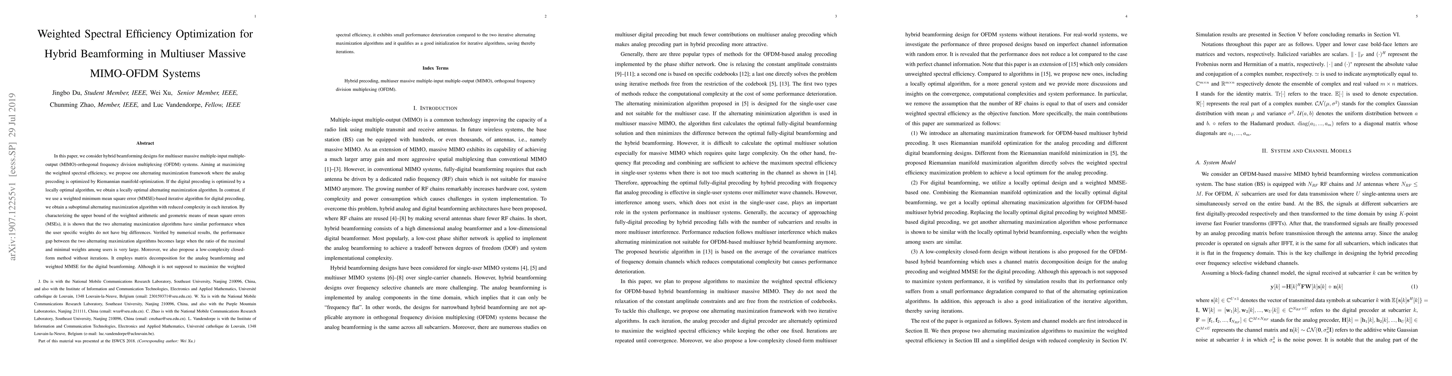 This paper proposes optimization frameworks for hybrid beamforming in multiuser massive MIMO-OFDM systems to maximize weighted spectral efficiency. It introduces two alternating maximization algorithms: one with locally optimal digital precoding and another with a weighted MMSE-based approach, showing similar performance under certain conditions. A low-complexity closed-form method is also presented for initialization, demonstrating minimal performance loss compared to iterative algorithms.