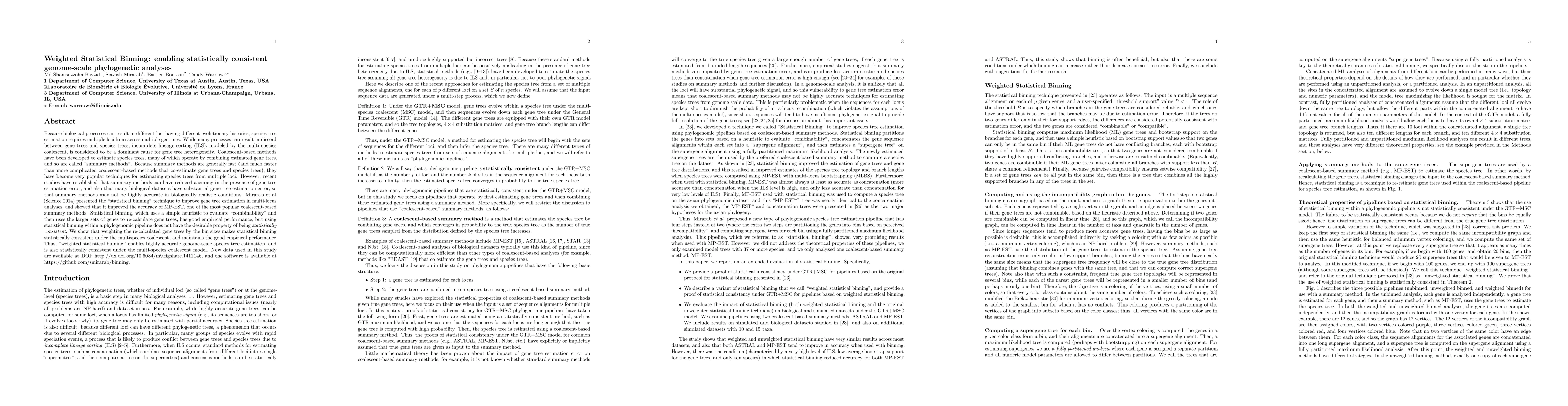 This paper introduces "weighted statistical binning" to improve the accuracy and statistical consistency of species tree estimation in genome-scale phylogenetic analyses. By weighting gene trees based on bin sizes, the method maintains empirical performance while ensuring statistical consistency under the multispecies coalescent model.