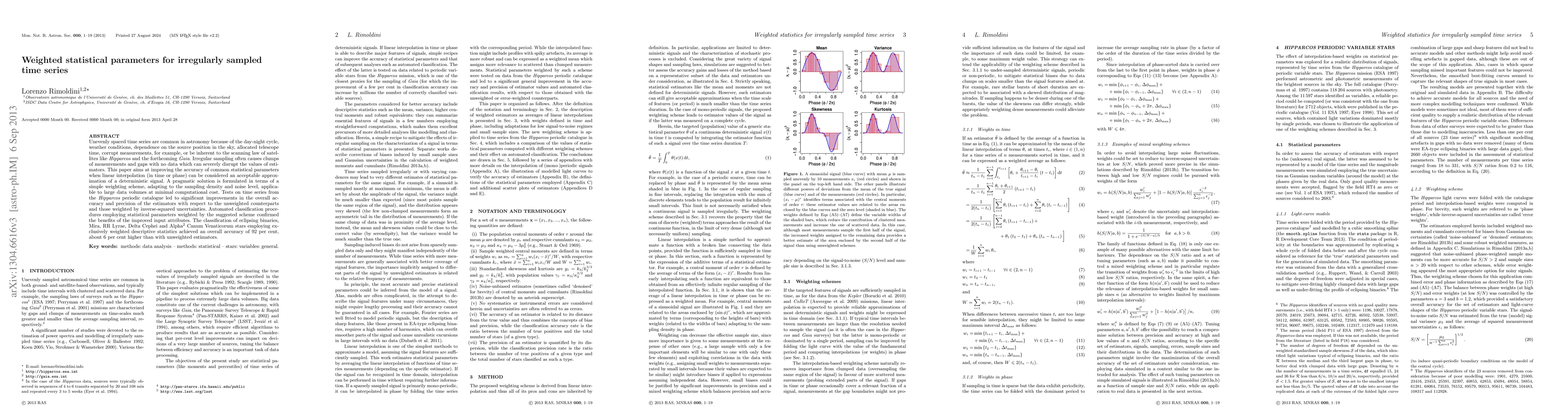 Unevenly spaced time series are common in astronomy because of the day-night cycle, weather conditions, dependence on the source position in the sky, allocated telescope time, corrupt measurements, for example, or be inherent to the scanning law of satellites like Hipparcos and the forthcoming Gaia. Irregular sampling often causes clumps of measurements and gaps with no data which can severely disrupt the values of estimators. This paper aims at improving the accuracy of common statistical parameters when linear interpolation (in time or phase) can be considered an acceptable approximation of a deterministic signal. A pragmatic solution is formulated in terms of a simple weighting scheme, adapting to the sampling density and noise level, applicable to large data volumes at minimal computational cost. Tests on time series from the Hipparcos periodic catalogue led to significant improvements in the overall accuracy and precision of the estimators with respect to the unweighted counterparts and those weighted by inverse-squared uncertainties. Automated classification procedures employing statistical parameters weighted by the suggested scheme confirmed the benefits of the improved input attributes. The classification of eclipsing binaries, Mira, RR Lyrae, Delta Cephei and Alpha2 Canum Venaticorum stars employing exclusively weighted descriptive statistics achieved an overall accuracy of 92 per cent, about 6 per cent higher than with unweighted estimators.